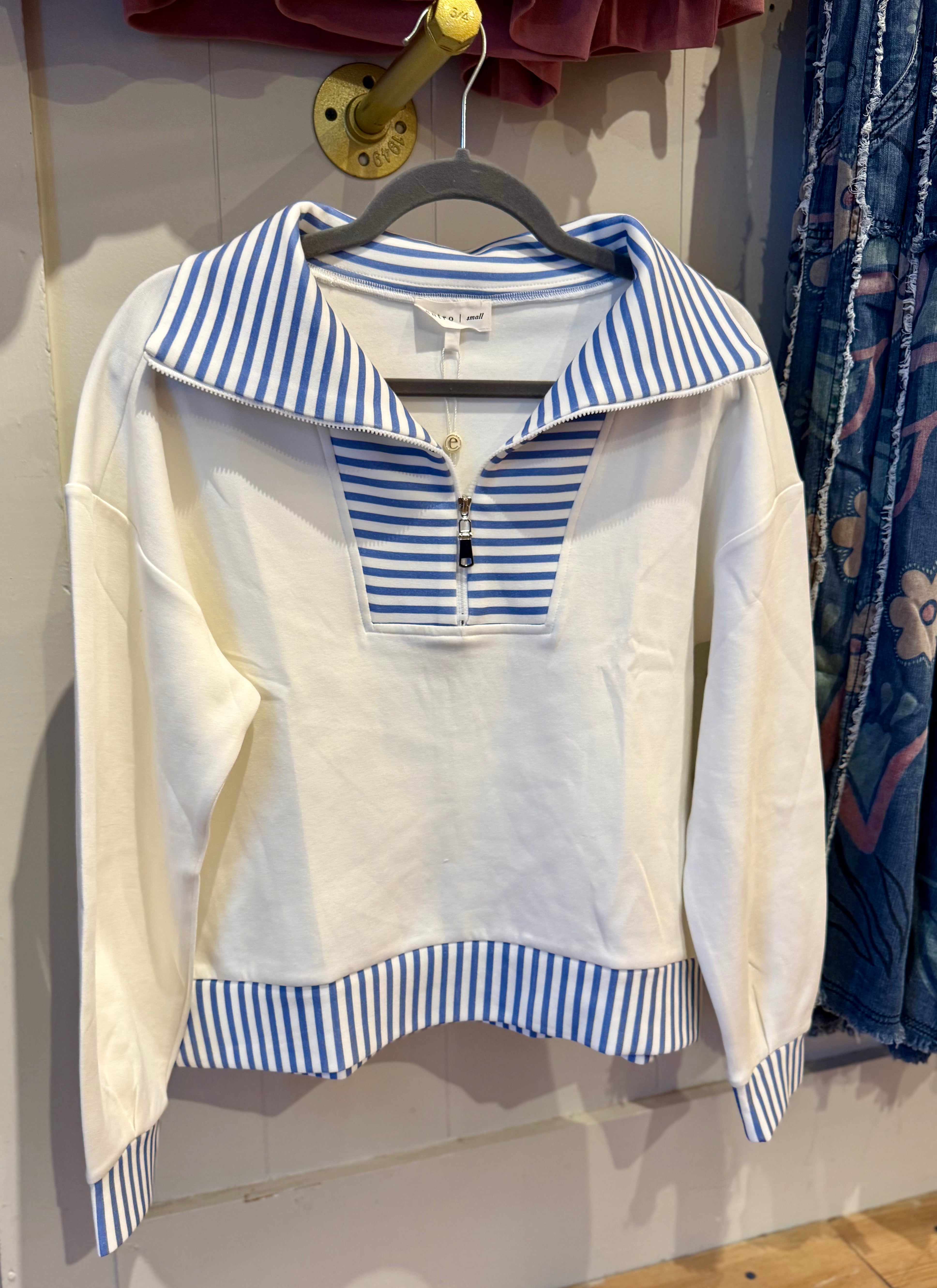 The Amelia Top features a solid long sleeve design with a practical half-zip closure, complemented by a contrast light blue striped collar and hem. Constructed from lightweight, non-sheer knit fabric, this unlined garment offers versatility and comfort, making it suitable for various occasions.