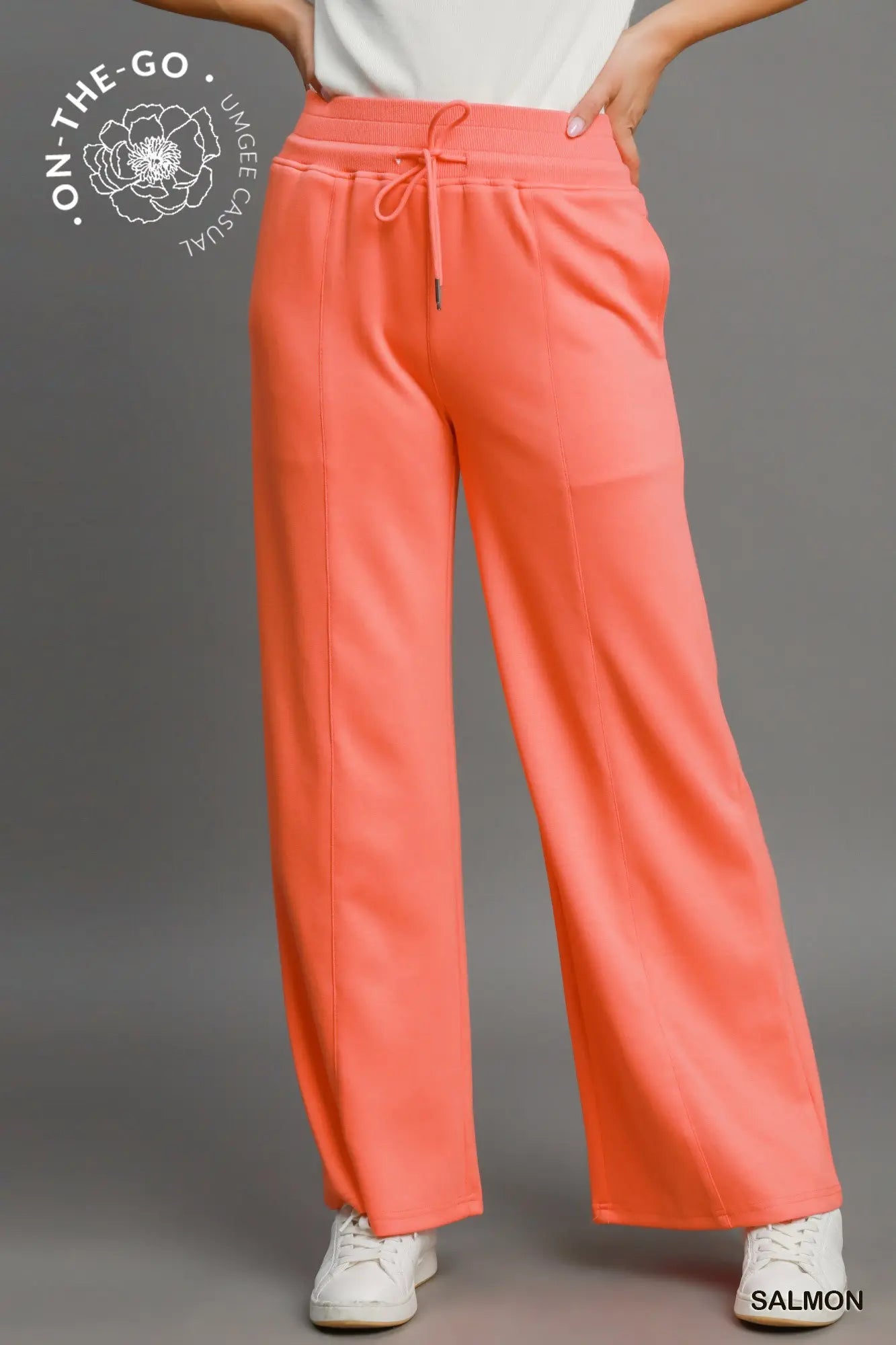 The Ansley Pant features a salmon color and a wide leg silhouette, providing both comfort and style. Its elastic waistband with drawstring ensures a customizable fit, while functional side pockets add practicality. The subtle center stitch detail enhances visual appeal, making these unlined pants suitable for various settings.