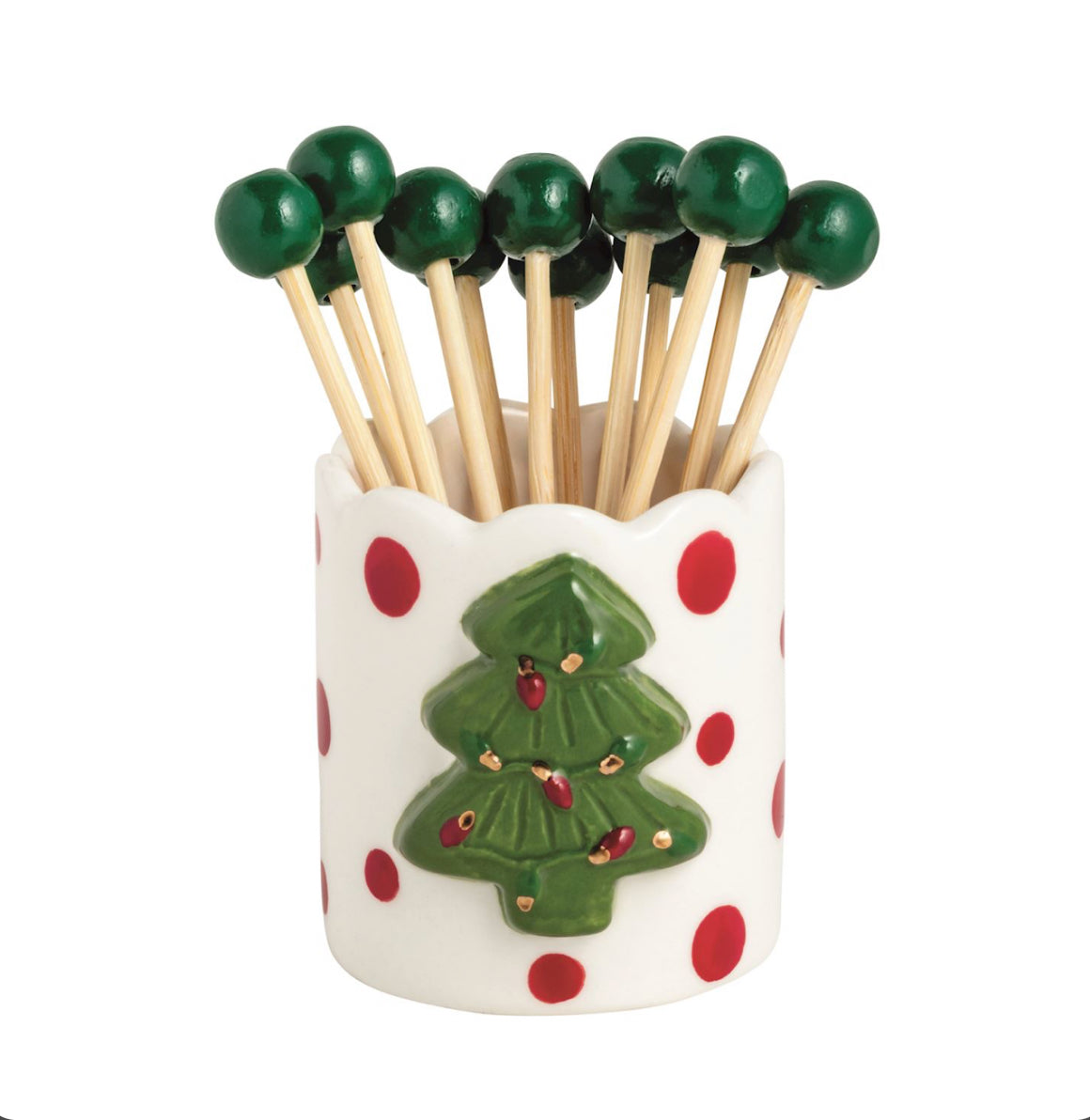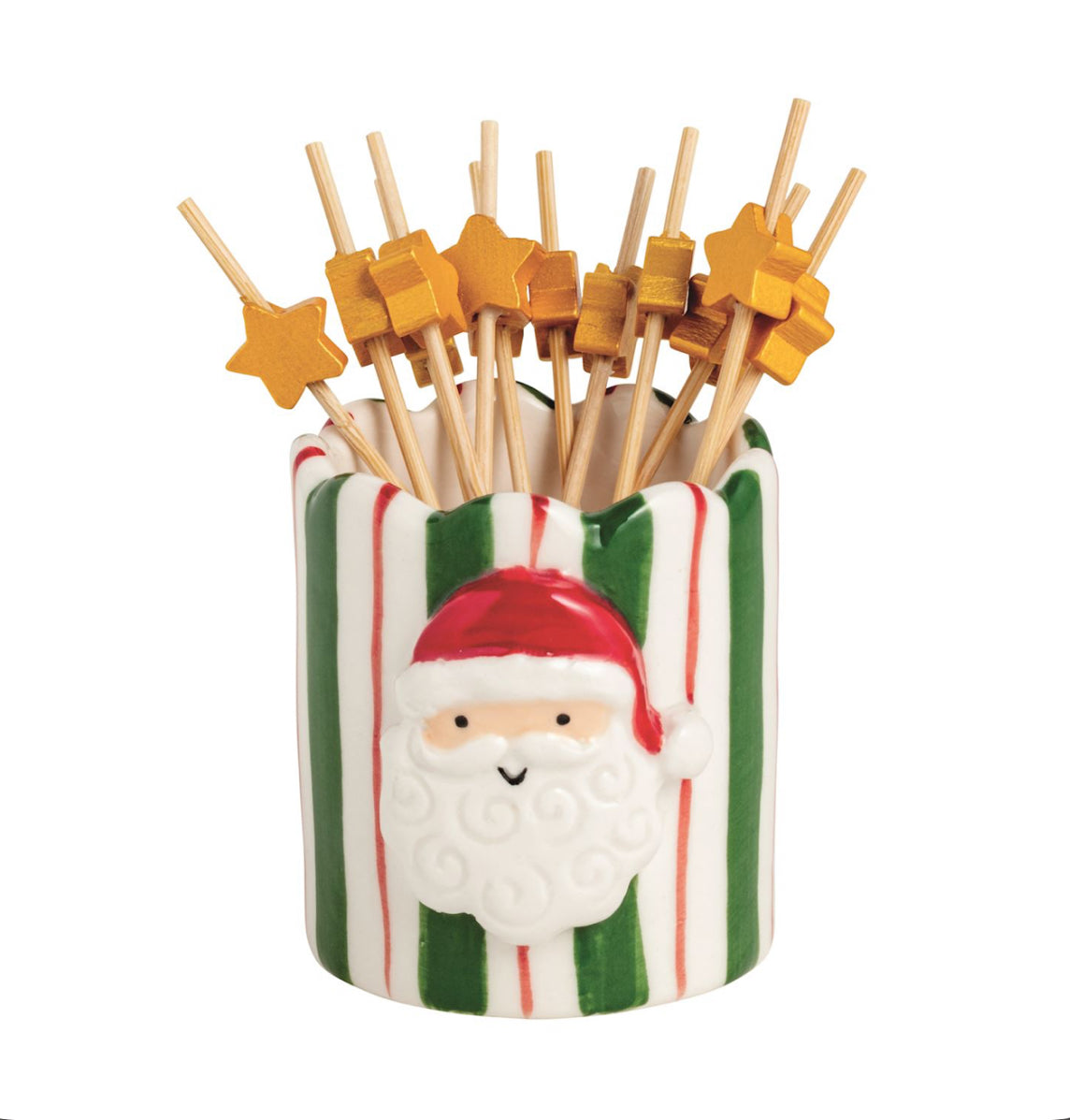 Hand-painted stoneware caddy comes with pack of wooden toothpicks with icon topper. Set comes wrapped in cello.