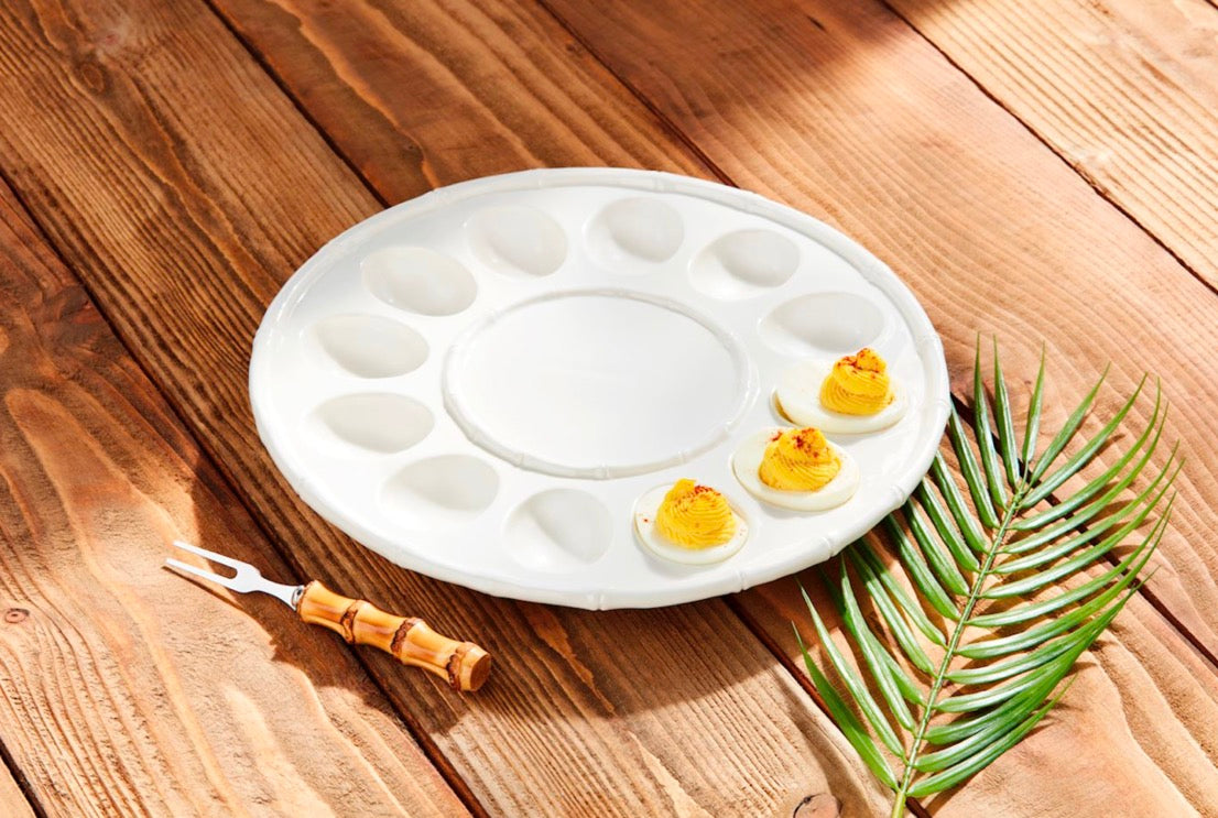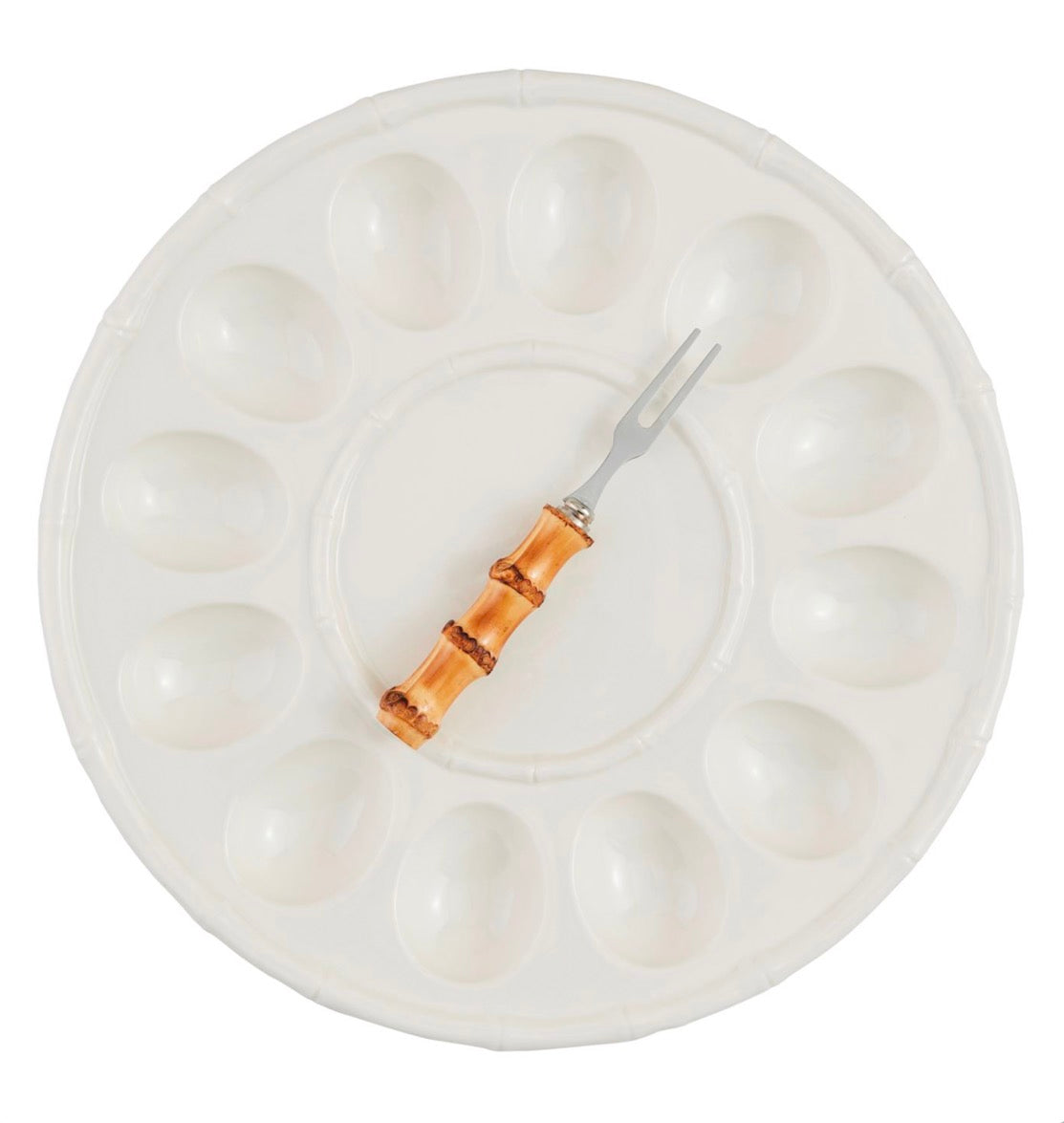 2-piece set. Stoneware deviled egg tray with bamboo textured detail. Comes with stainless steel fork with bamboo wood handle.
