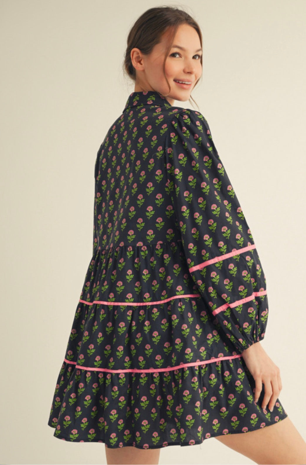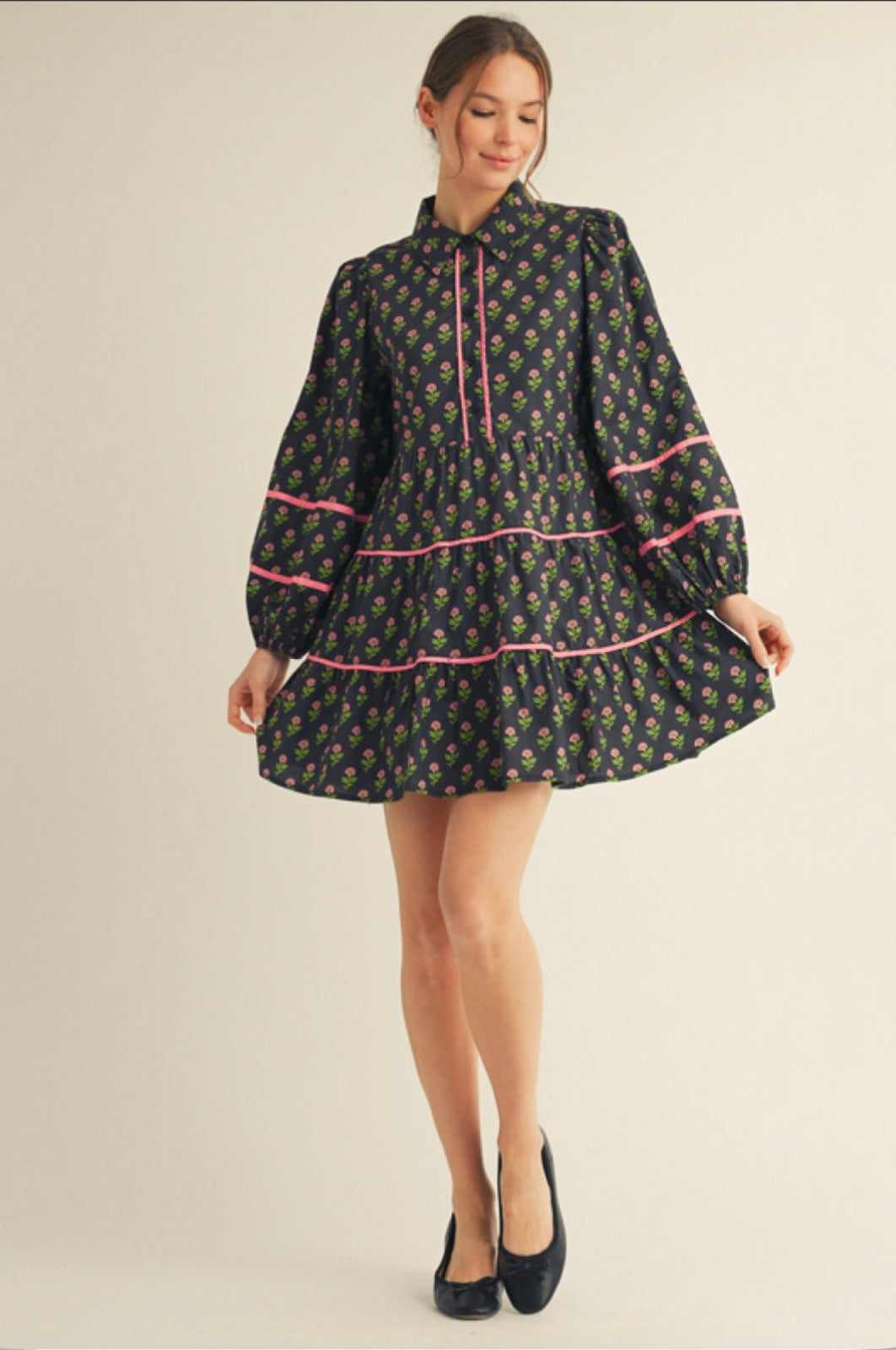 The Becca Dress features long sleeves, a button down design, and a tiered floral print. The contrasting trim adds a touch of elegance, while the collared neckline provides a polished look. Stay stylish and sophisticated in this versatile dress.