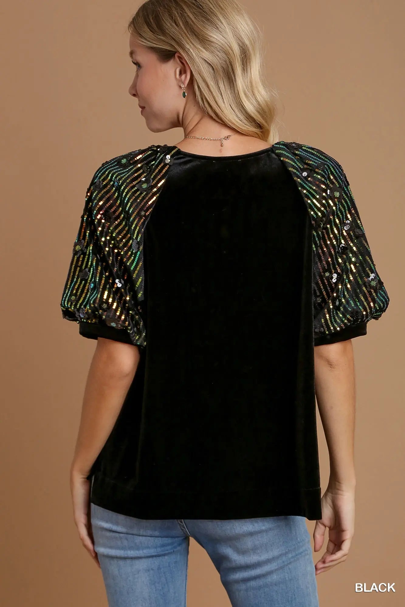 The Bethany Top boasts a touch of luxury with its velvet and sequin design. The elegant puff sleeves add a feminine touch, while the classic black color makes it a versatile addition to any wardrobe. Elevate your style while feeling confident in this chic and trendy top.
