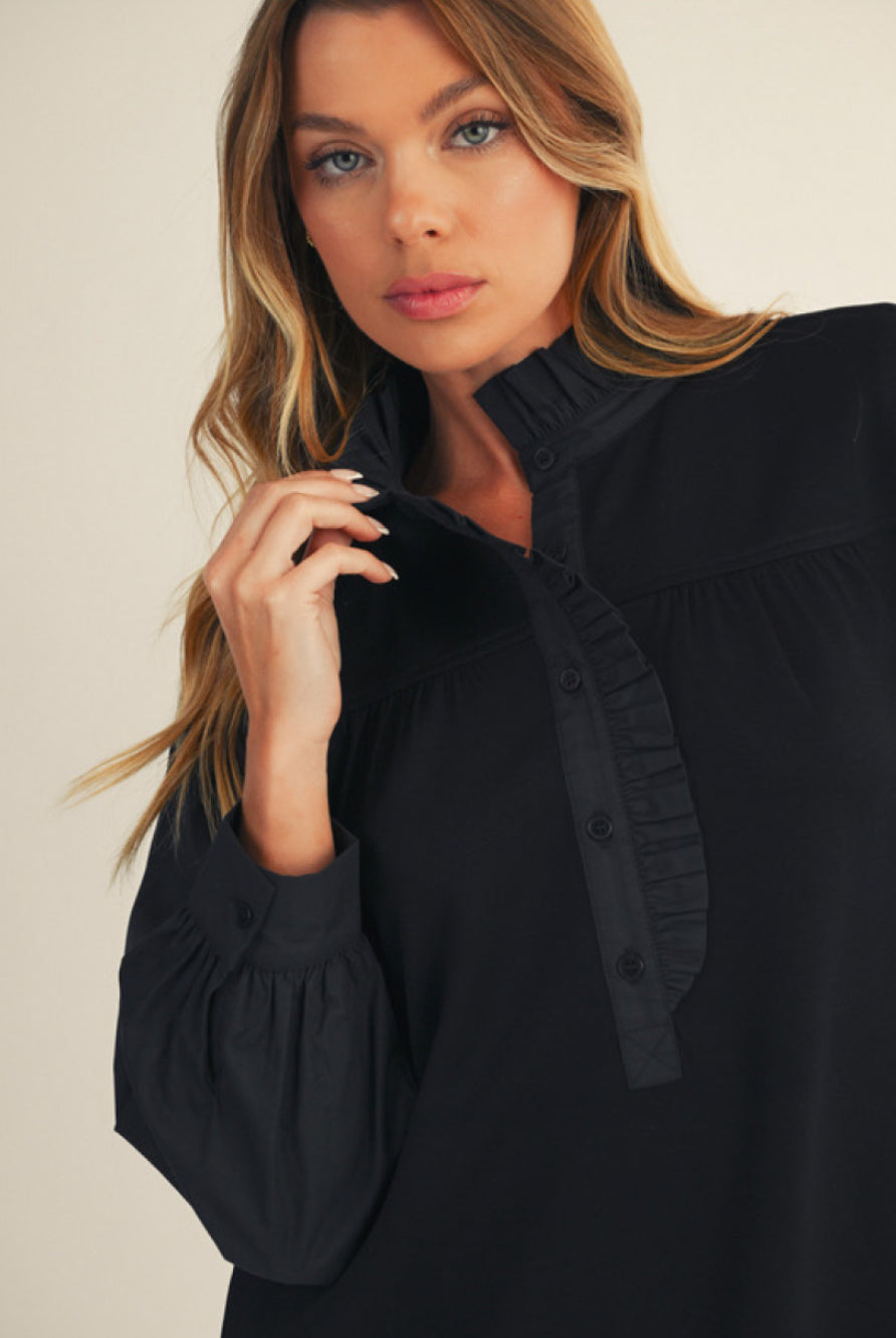 The Brianna Dress boasts long sleeves, convenient side pockets, and a stylish button up design. The charming ruffle detail adds a touch of femininity. Stay both fashionable and functional with this must-have dress.