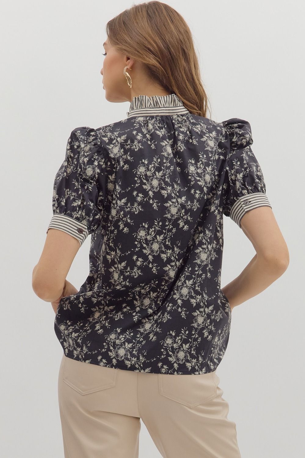 Floral print puff shoulder short sleeve top featuring striped contrast accent ruffle neck band. Button front closure. Unlined. Woven. Non-sheer. Lightweight.