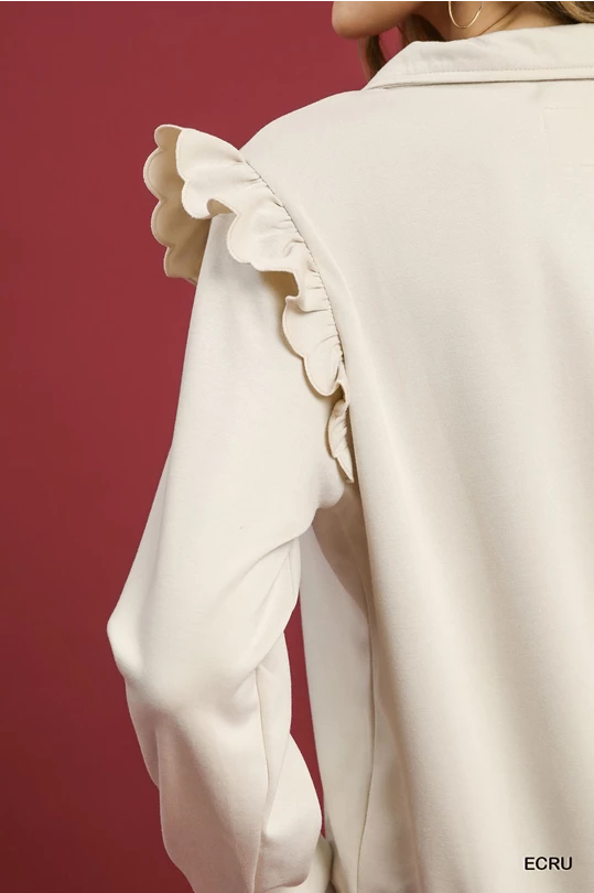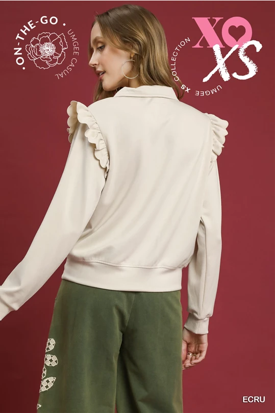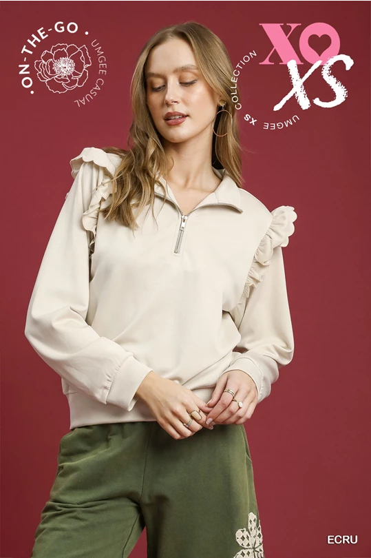 As an expert in quality garments, our Candace Pullover in cream is crafted with 100% Luxeknit fabric, ensuring comfort and durability. The quarter zip, long sleeve design is accented with ruffle shoulder and scalloped details, adding a touch of elegance. Upgrade your wardrobe with this versatile piece.