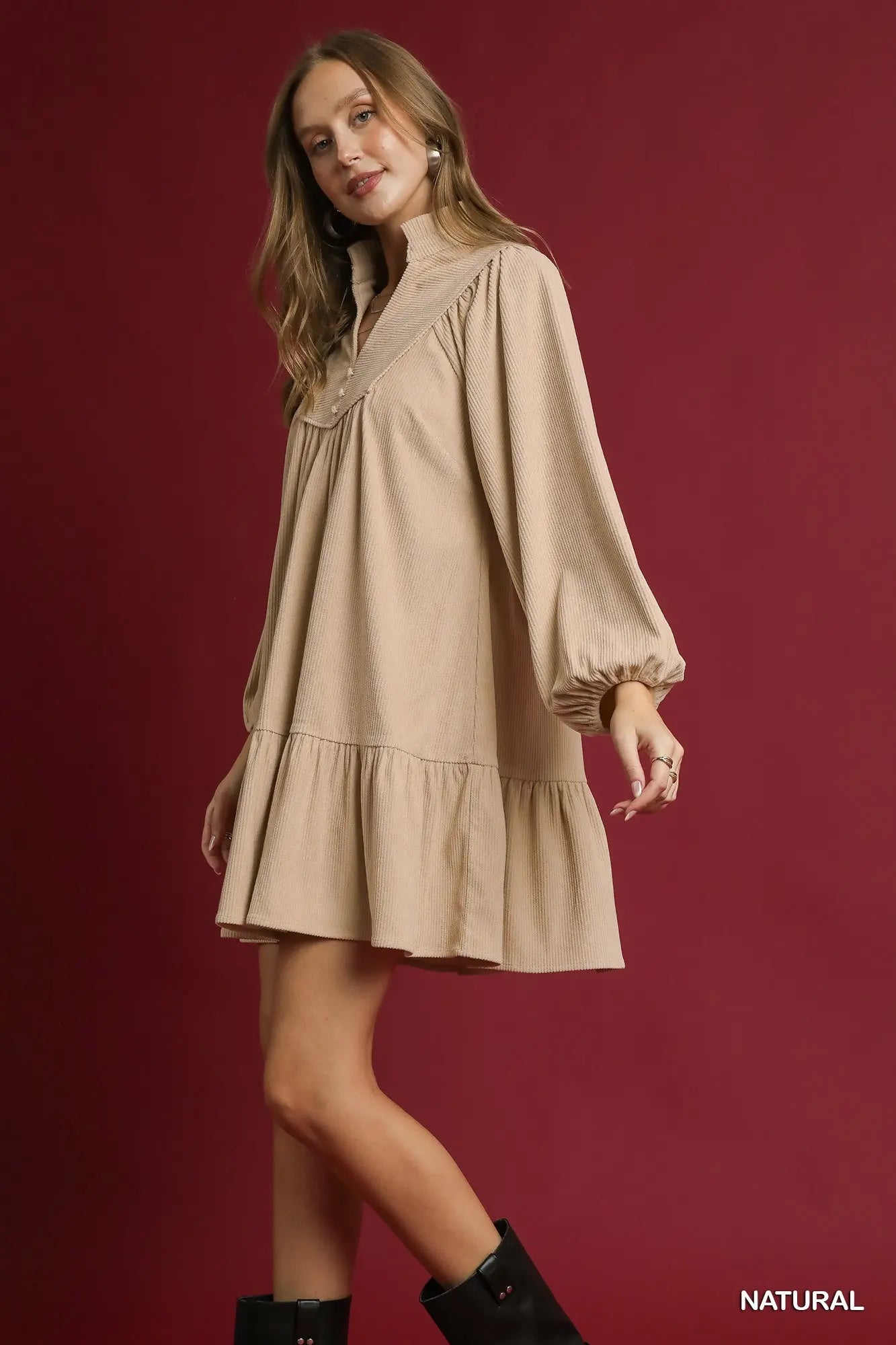 The Cassidy Dress combines soft corduroy fabric with a v-neck and button detail, long ballon sleeves, and a relaxed, loose babydoll silhouette. The tiered ruffle hemline adds a feminine touch. Stay comfortable and stylish in this must-have dress.