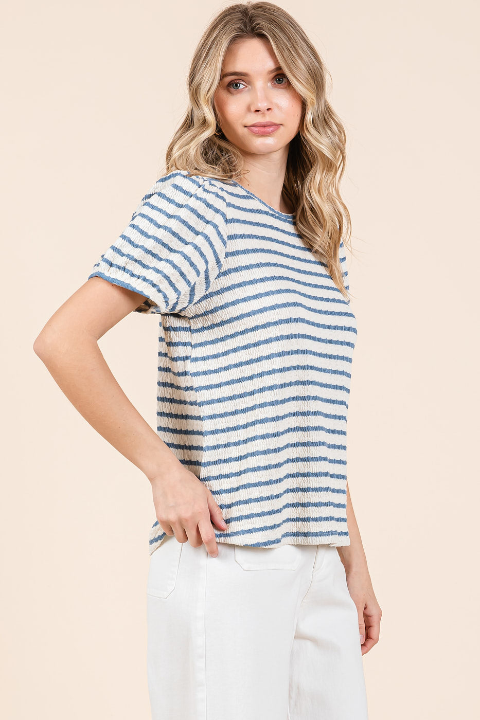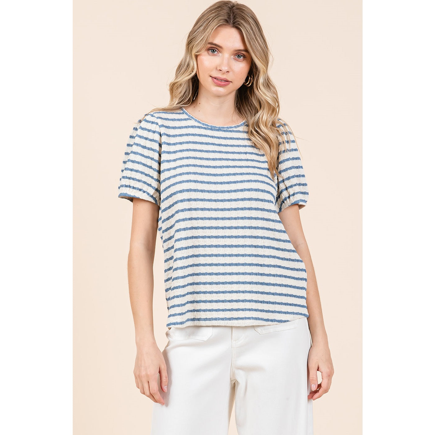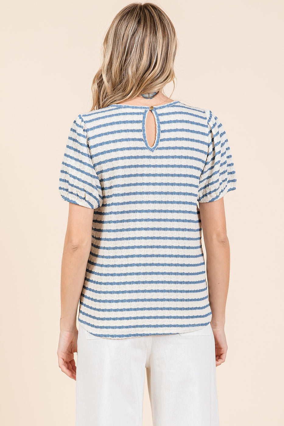 The Cora Top features a classic stripe print, a delicate keyhole back with button closure, and a classic round neck. The trendy puff sleeve adds a touch of sophistication. Perfect for a stylish and chic look.