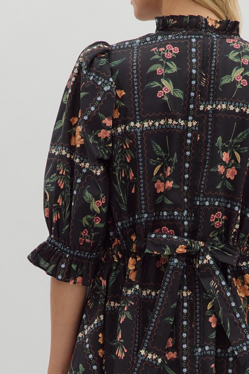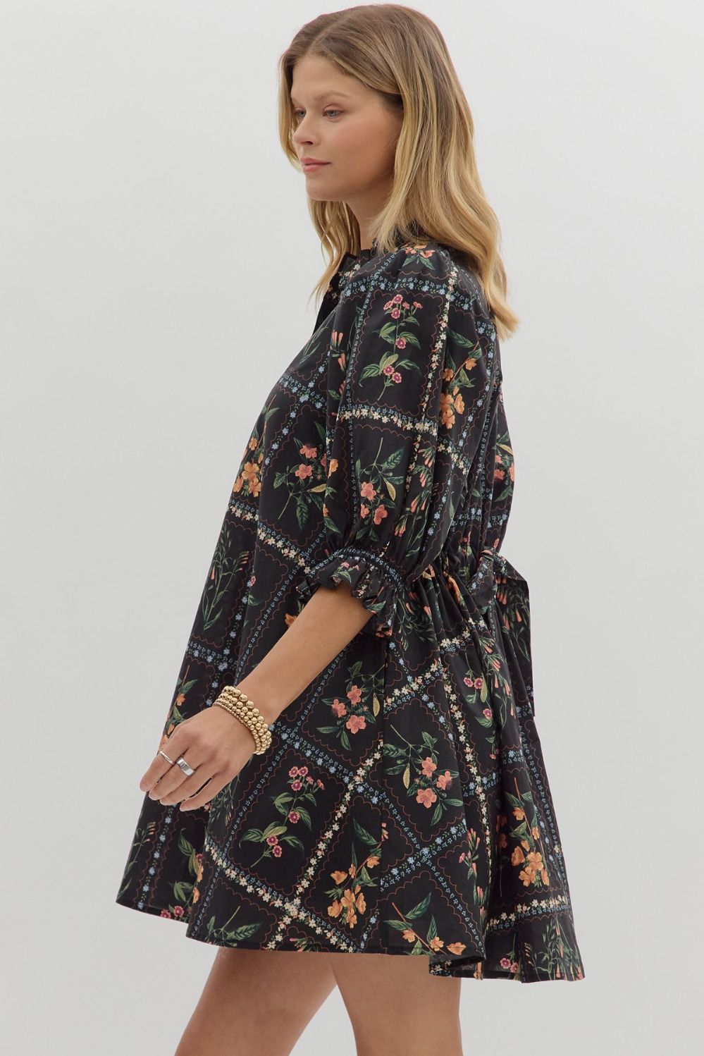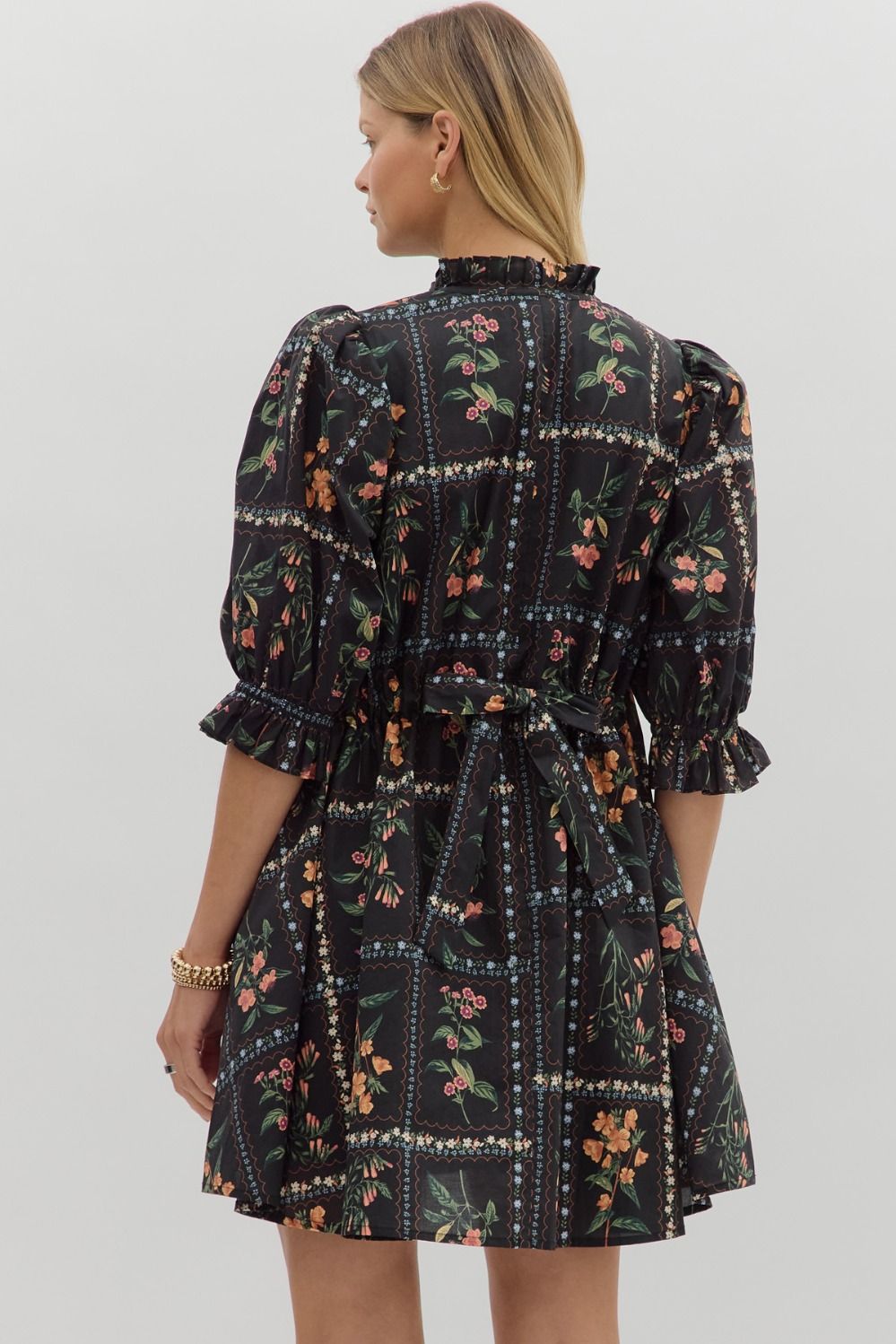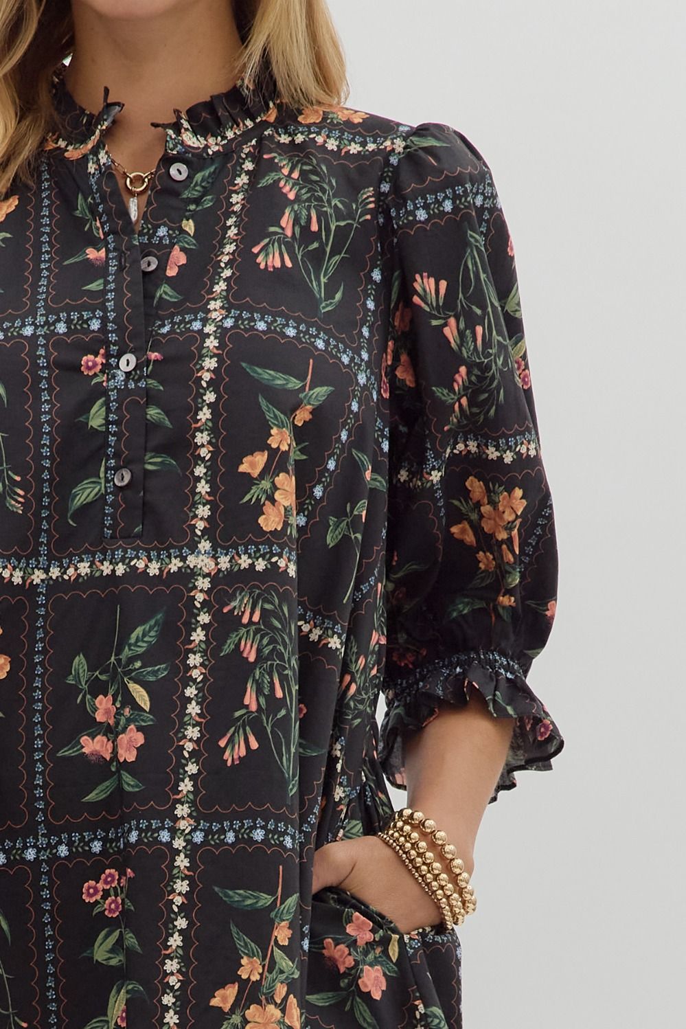 Floral panel ¾ ruffle finish puff sleeve pleated round neck button closure at front mini dress featuring adjustable back waist. Side pockets. Lined. Woven. Non-sheer. Lightweight.