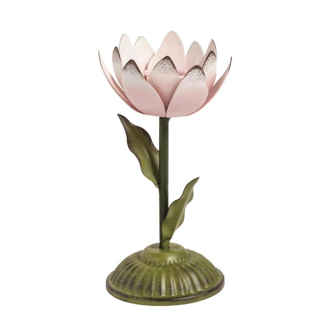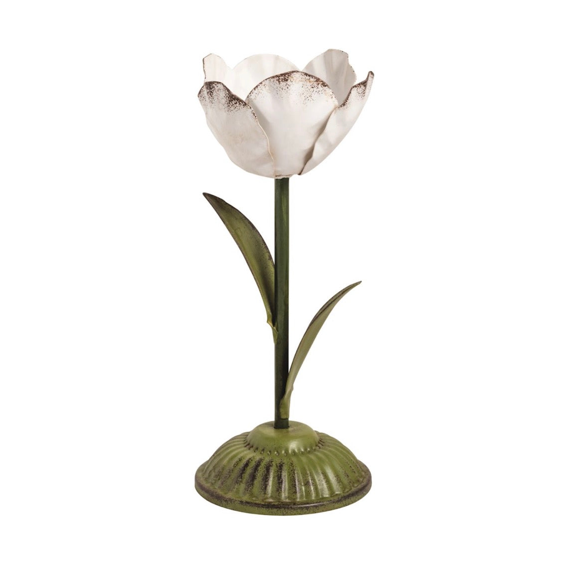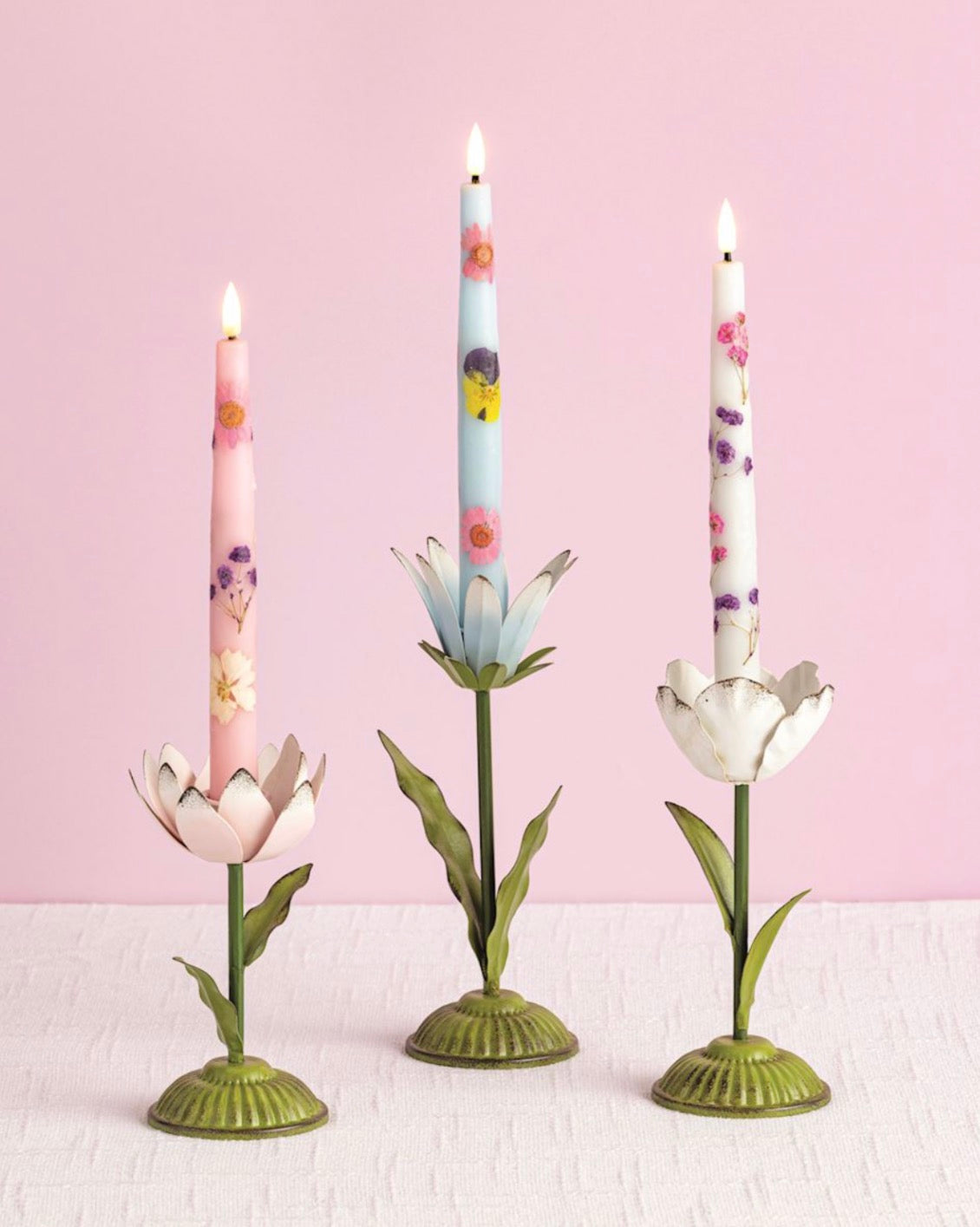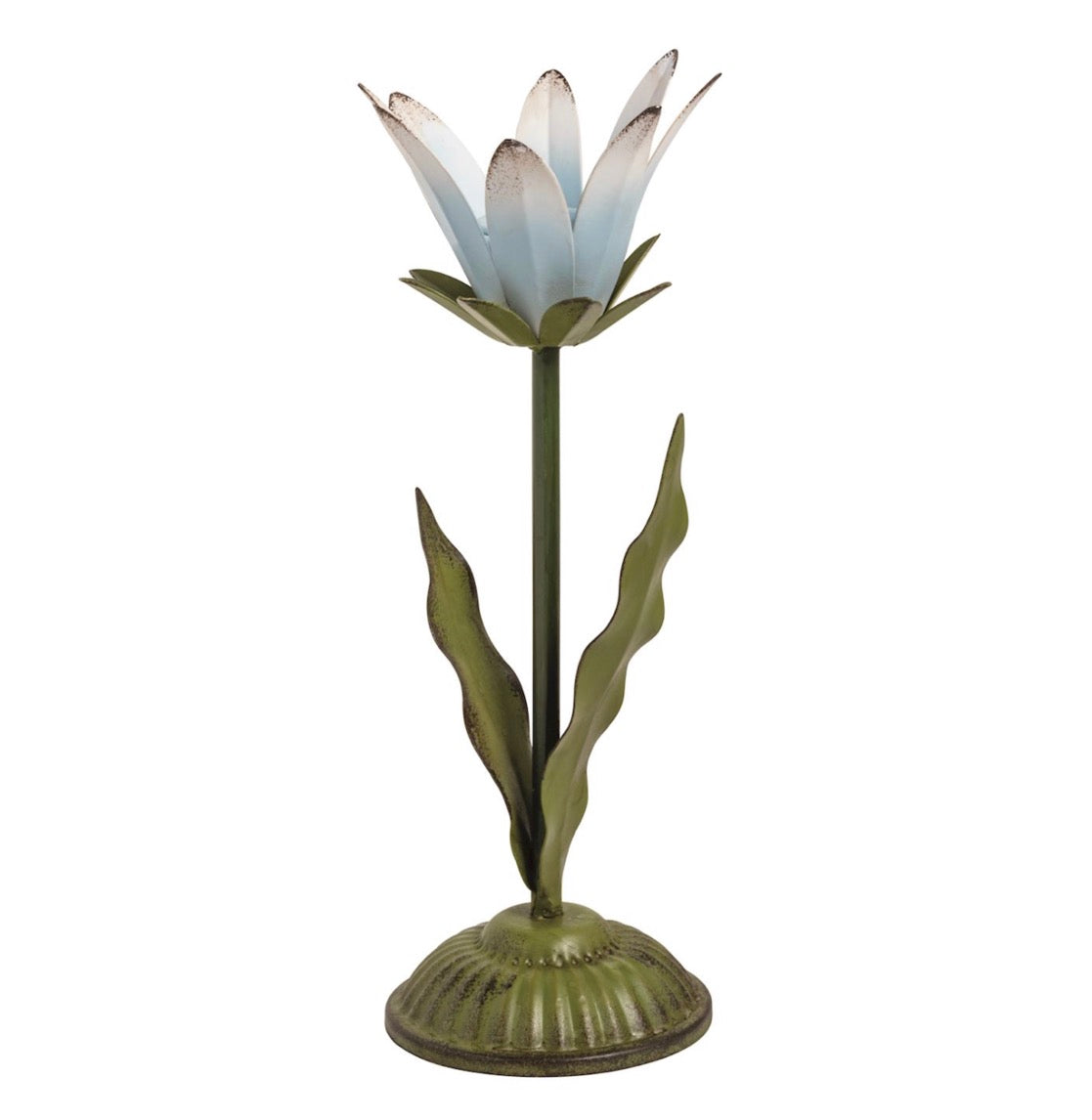 Hand-painted figural flower metal candlestick holds taper candle.