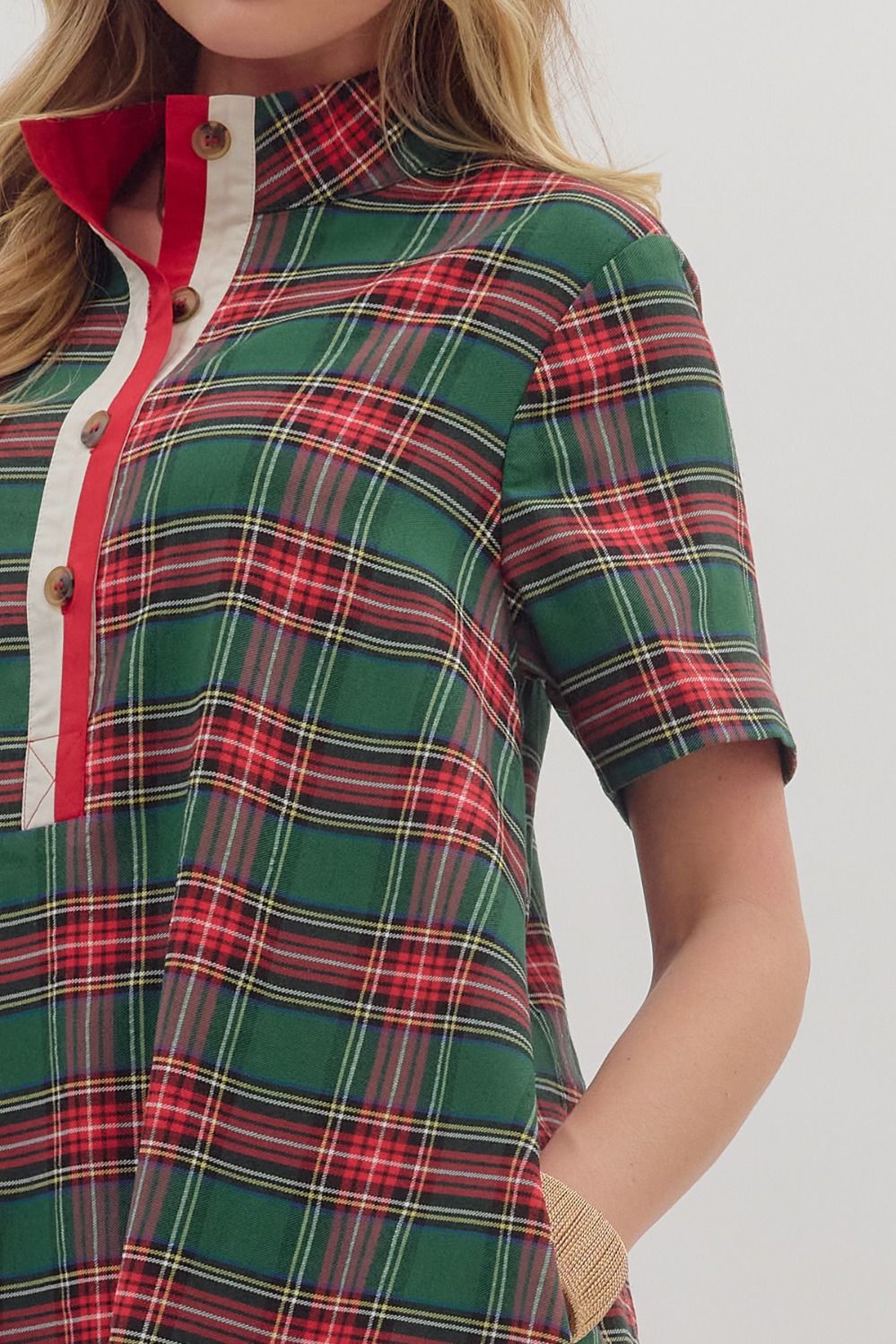 Plaid short sleeve mini dress featuring contrast buttoned placket and collar lining. Side pockets. Lined. Woven. Non-sheer. Lightweight.