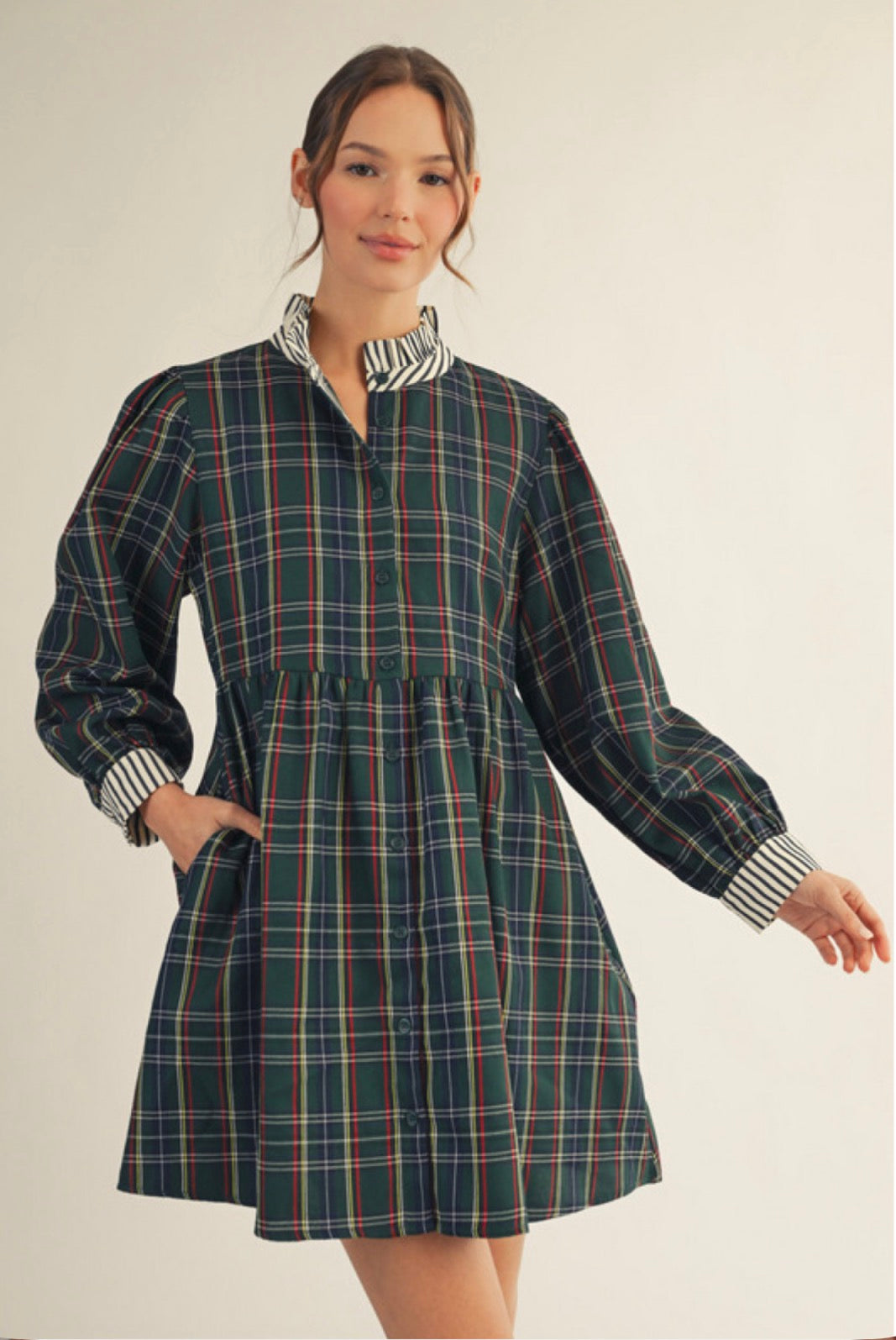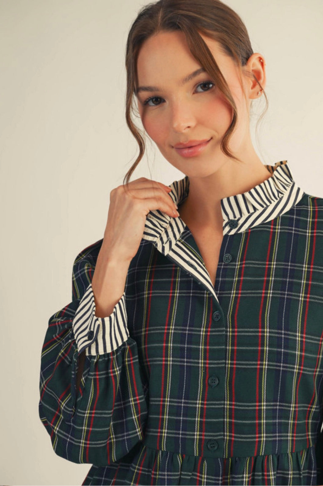 Constructed with a long sleeve, this Harper Dress is perfect for colder weather. With a button-down design and plaid pattern, it offers a classic and timeless look. The added stripe contrast and ruffled neckline give the dress a touch of femininity and elegance.