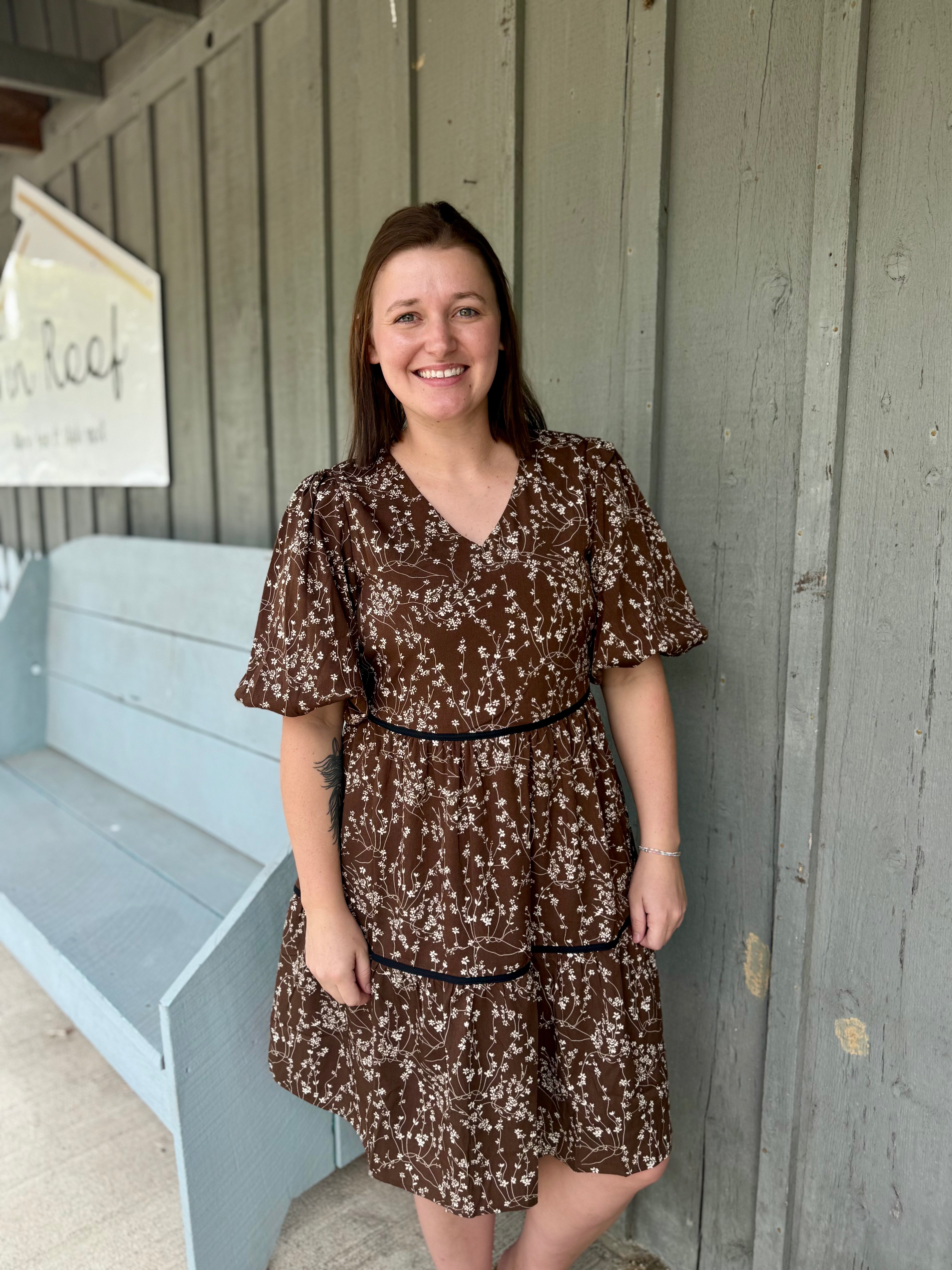 Introducing the Mackenzie Dress, featuring a classic mocha hue and elegant cream floral print. With a feminine back tie and elastic puff sleeves, this dress is perfect for any occasion. Elevate your wardrobe with this sophisticated piece.