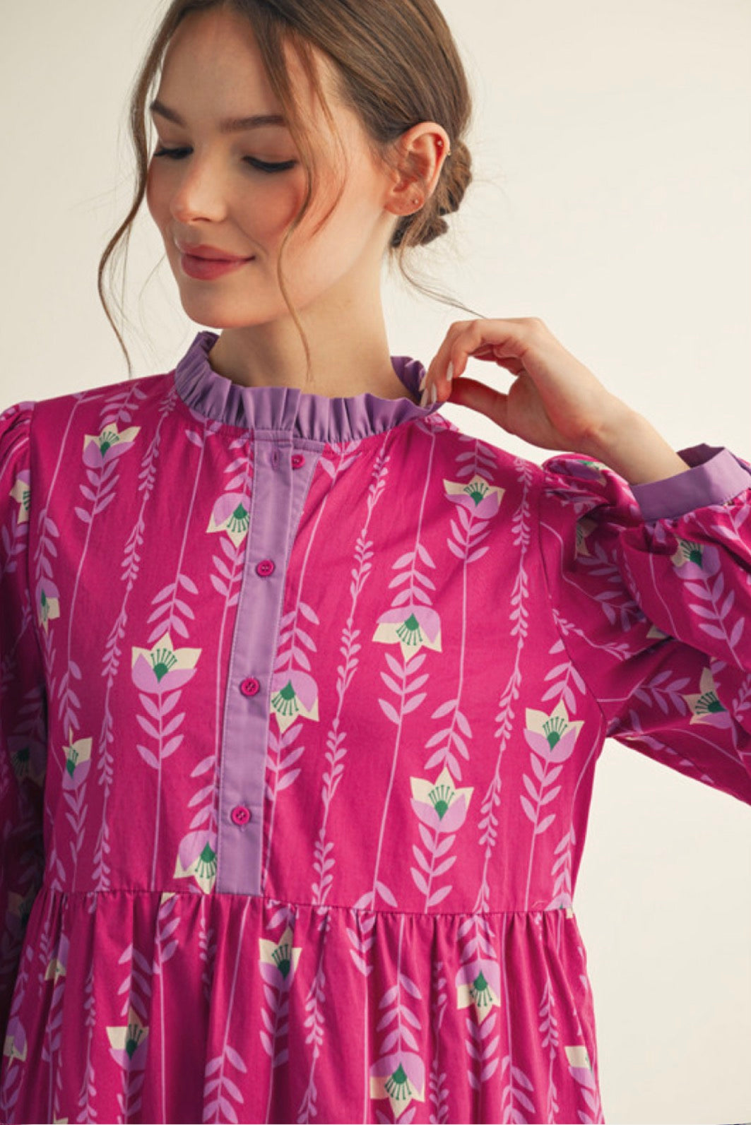This Madison Dress features long puff sleeves, a tiered floral midi design, convenient side pockets, a front button-up closure, and a delicate ruffled neckline. Stay effortlessly stylish and comfortably chic in this versatile dress. Perfect for any occasion, this dress is a must-have addition to your wardrobe.