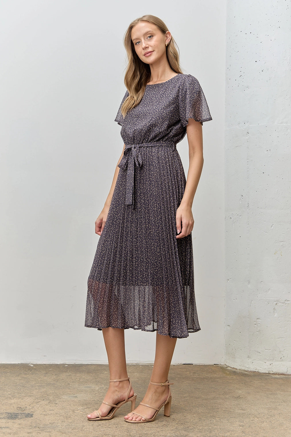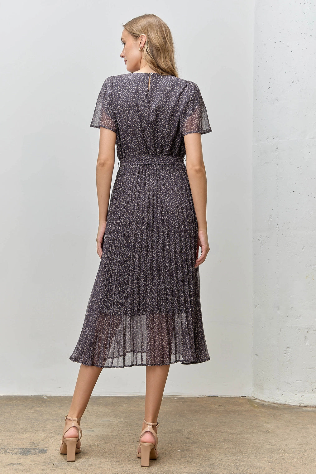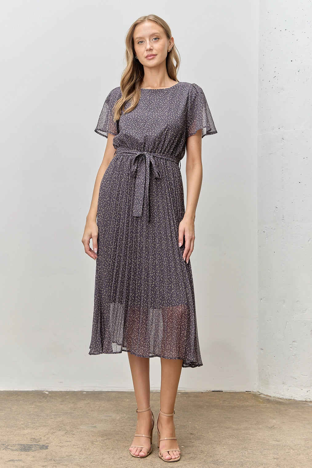 With a beautiful grey background, the Patricia Dress boasts a sophisticated midi length and elegant short sleeves. The pleated design adds a touch of movement and flair to this timeless piece. Perfect for any occasion, this dress exudes effortless style and grace.