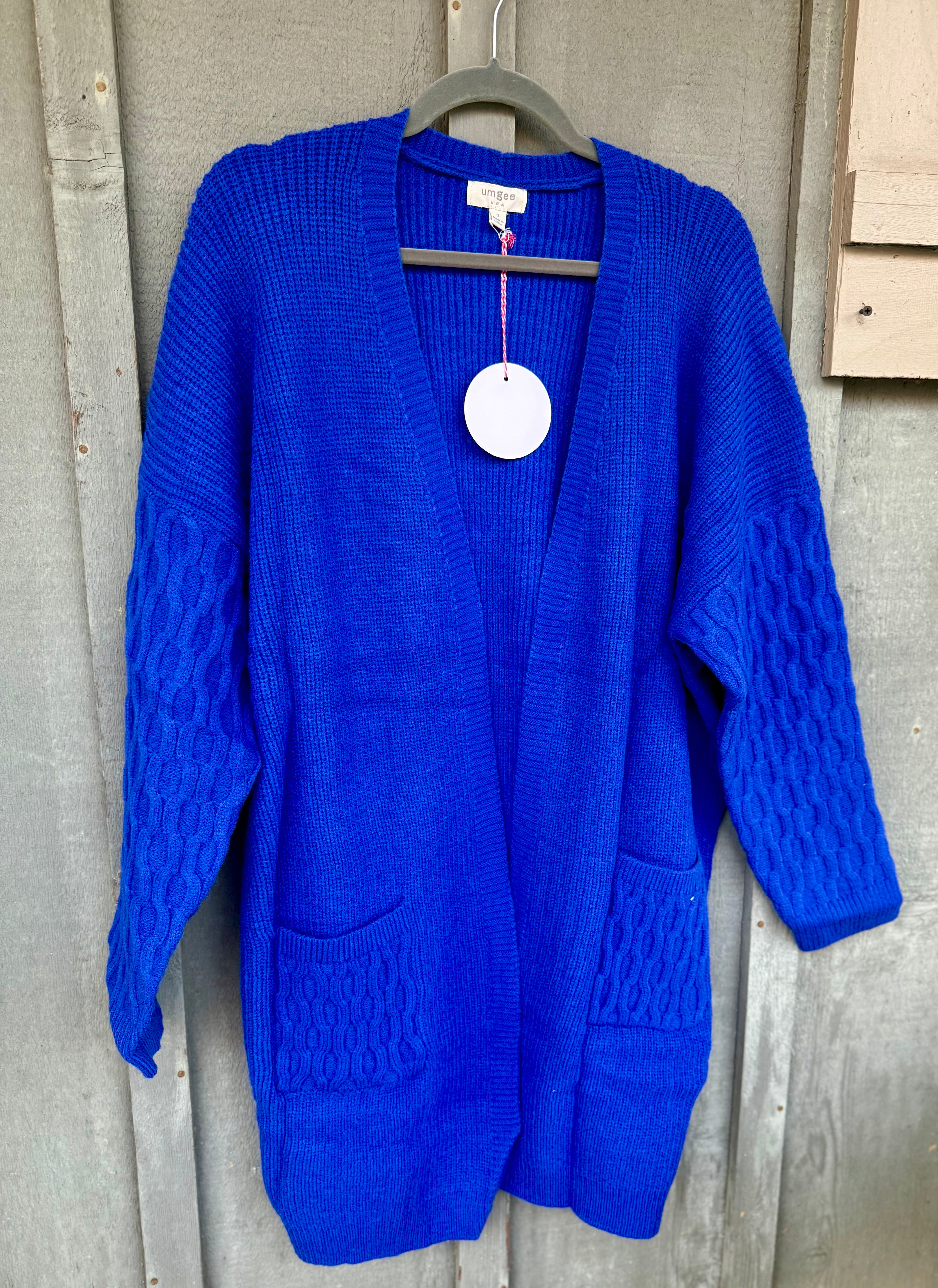 "Stay cozy and stylish with our Remi Cardigan. Made from a soft, royal blue knit, this cardigan is the perfect addition to any outfit. With a convenient pockets, you can carry your essentials while looking chic. Perfect for any occasion, this cardigan will keep you warm and fashionable."