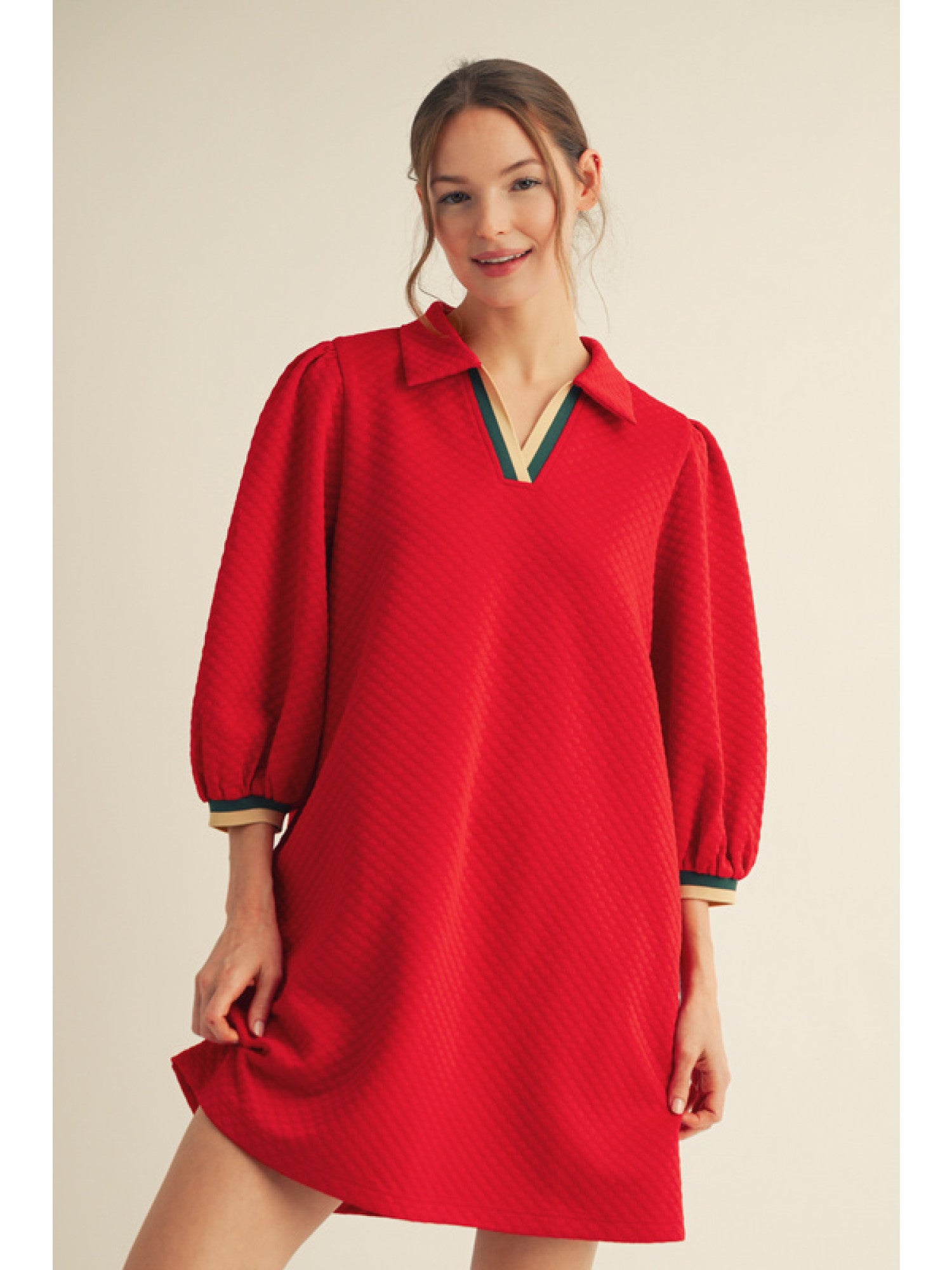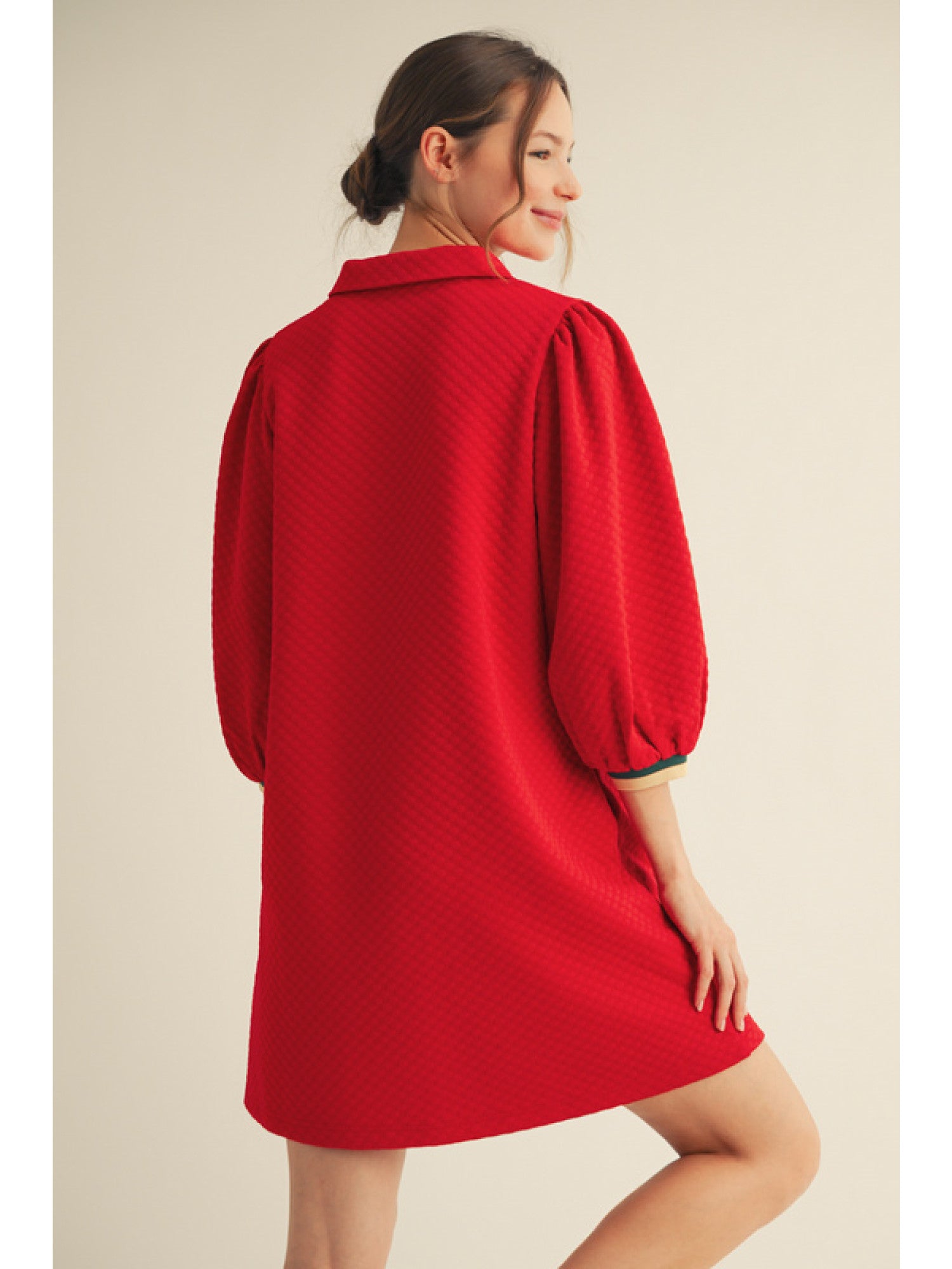 Introducing the Renae Dress. This casual dress features a collared neckline and 3/4 puffed sleeves, perfect for a day out. Made with textured fabric, it's comfortable and stylish. Expertly crafted for everyday wear.