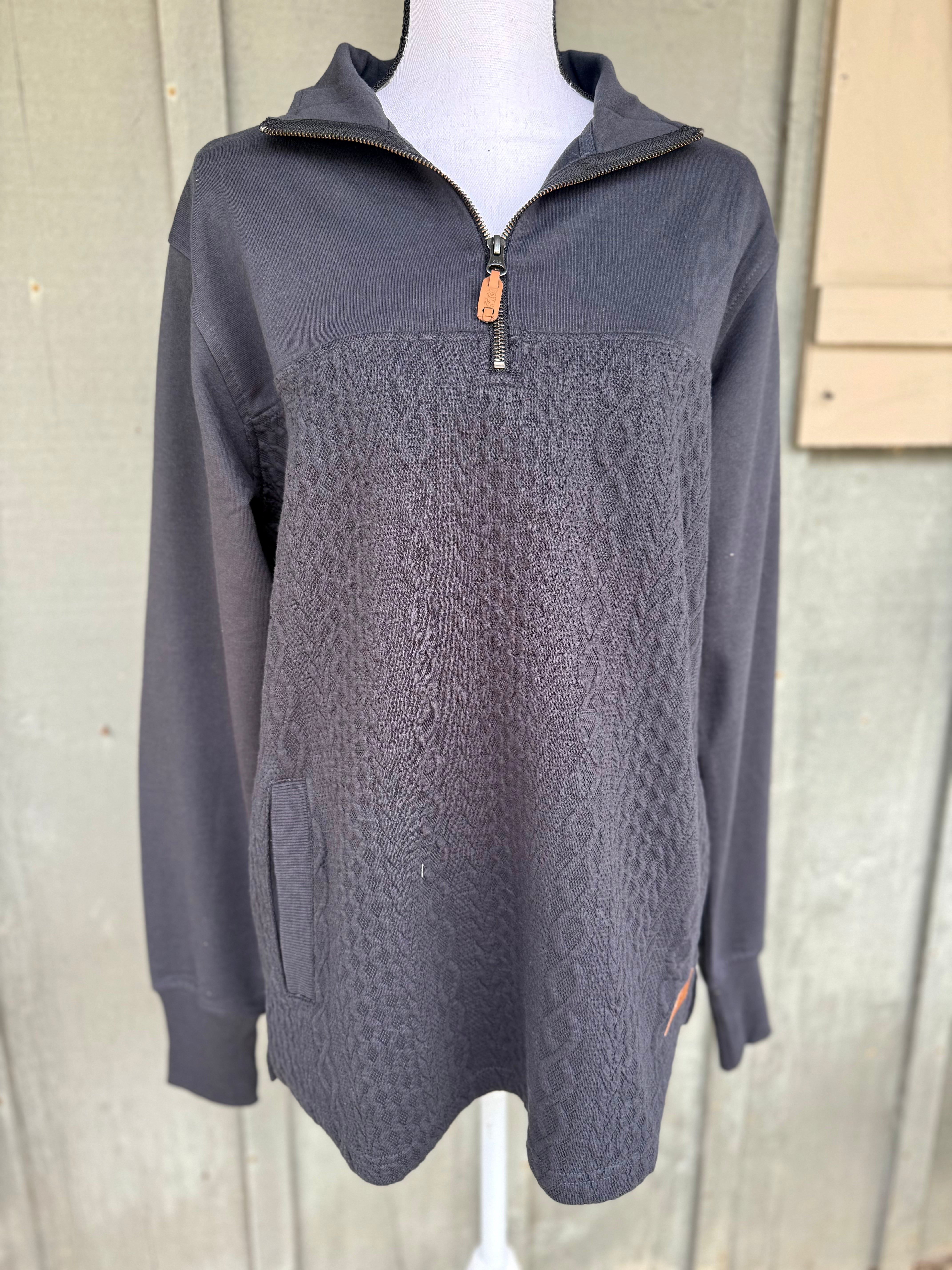 The Royce Black Filmont Quarter Zip is expertly crafted with a chunky knit fabric in a classic black color. This quarter zip offers a professional yet stylish look, perfect for any occasion. Stay warm and comfortable while making a statement with Royce.