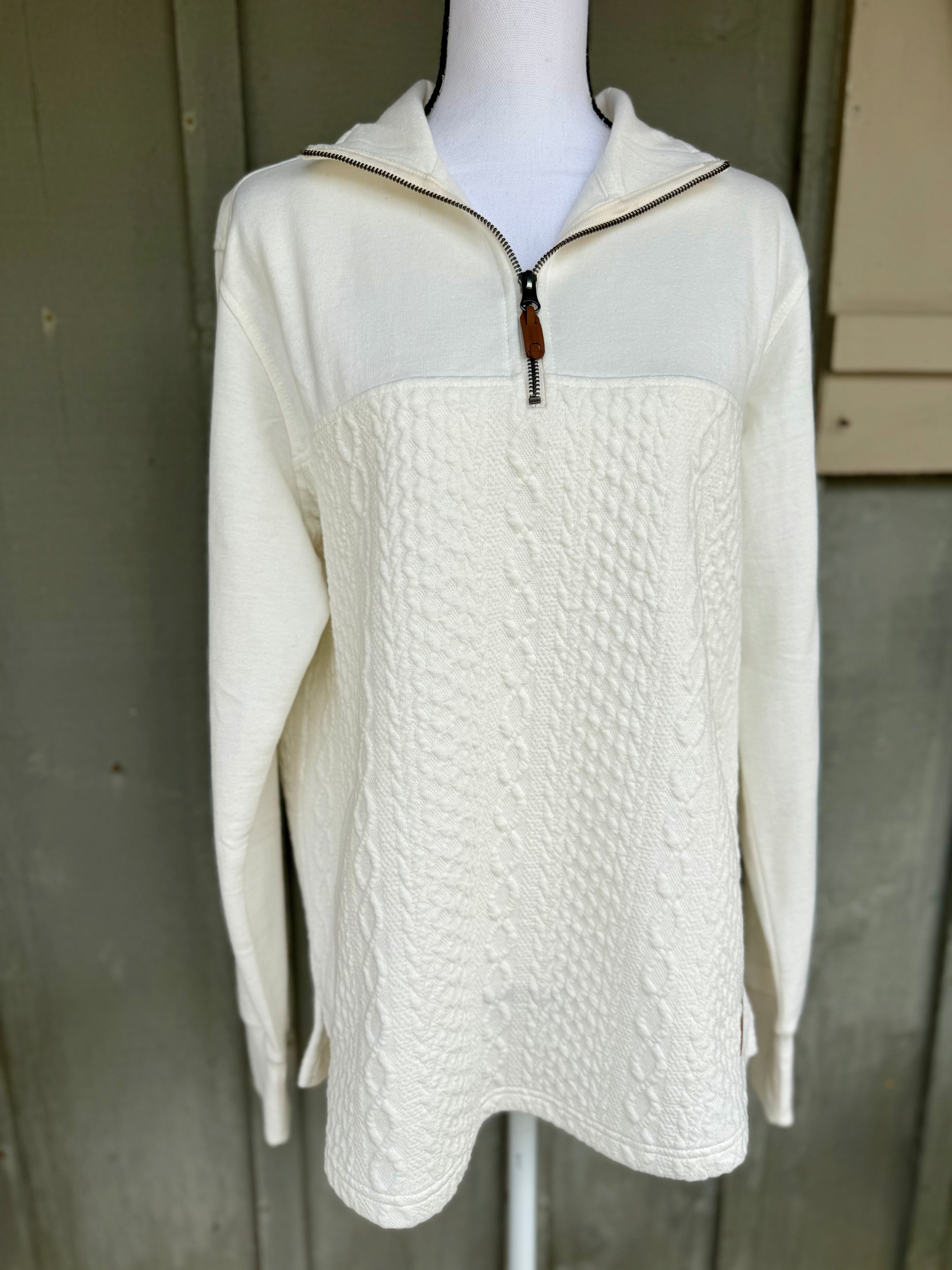 Expertly crafted by Royce, the Ivory Filmont Quarter Zip offers effortless style and comfort. Made from chunky knit fabric, this quarter zip is perfect for any occasion. Its classic ivory color adds a touch of elegance, making it a versatile and essential addition to your wardrobe.