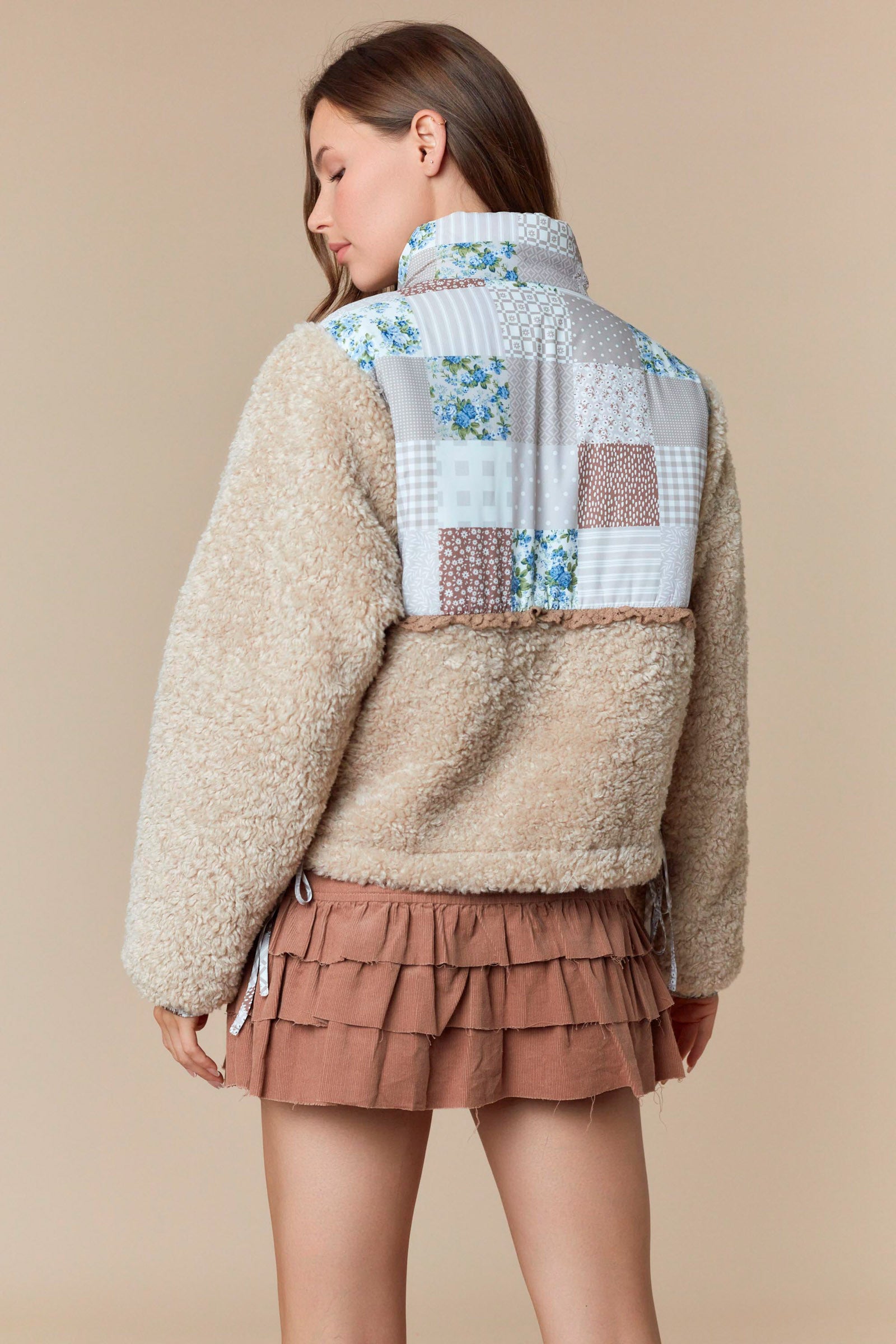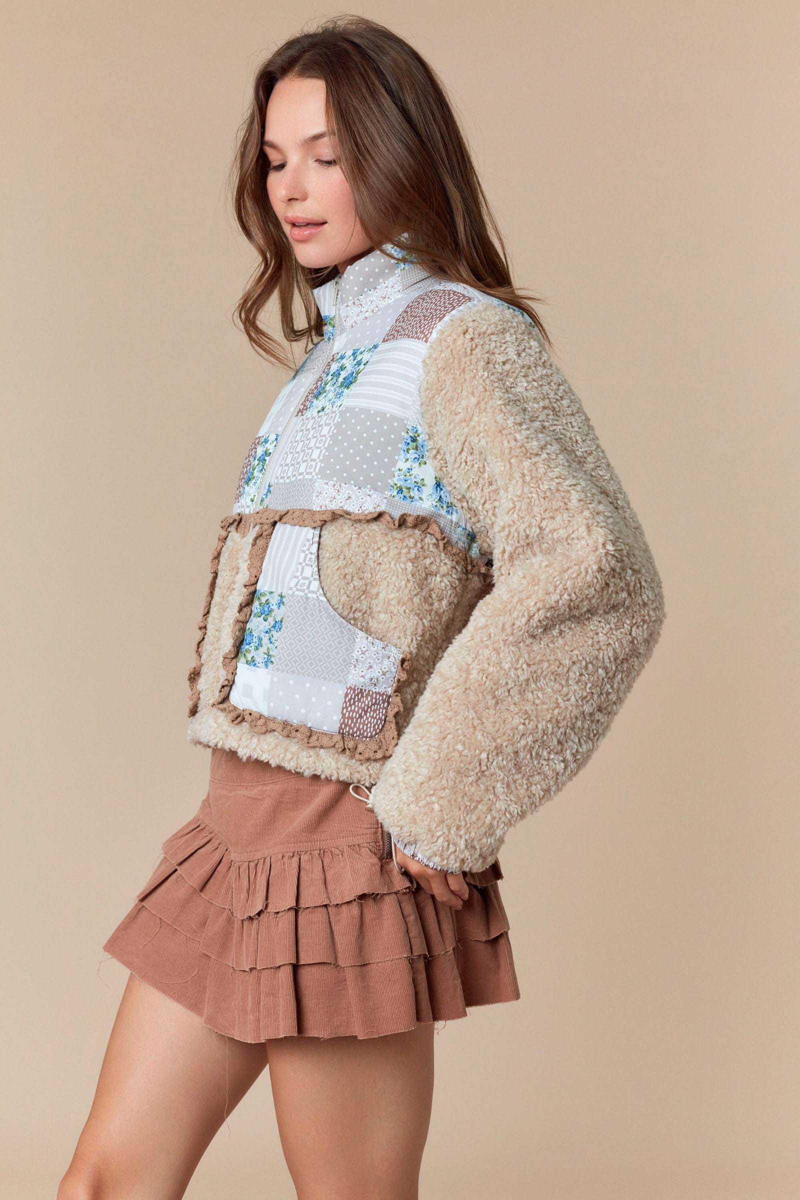 The Savannah Jacket is a stylish addition to any wardrobe. With a unique multi-print color block design and delicate ruffle detailing, it offers a modern and feminine touch. The sherpa lining provides warmth and comfort, while the jacket's pockets add functionality. Perfect for cooler weather, this jacket is a versatile and fashionable choice.