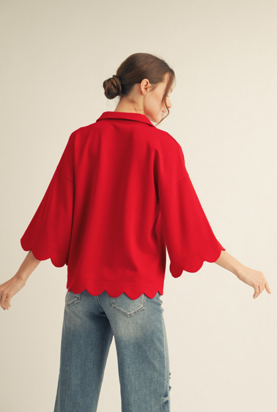 The Teagan Top is a versatile choice for any wardrobe. Featuring 3/4 sleeves and a v-neck, this top is designed with a scalloped edge detail and collared neckline for a sophisticated touch. The rich tomato red color adds a pop of vibrancy to any outfit. Perfect for any occasion, the Teagan Top is a must-have addition to your closet.