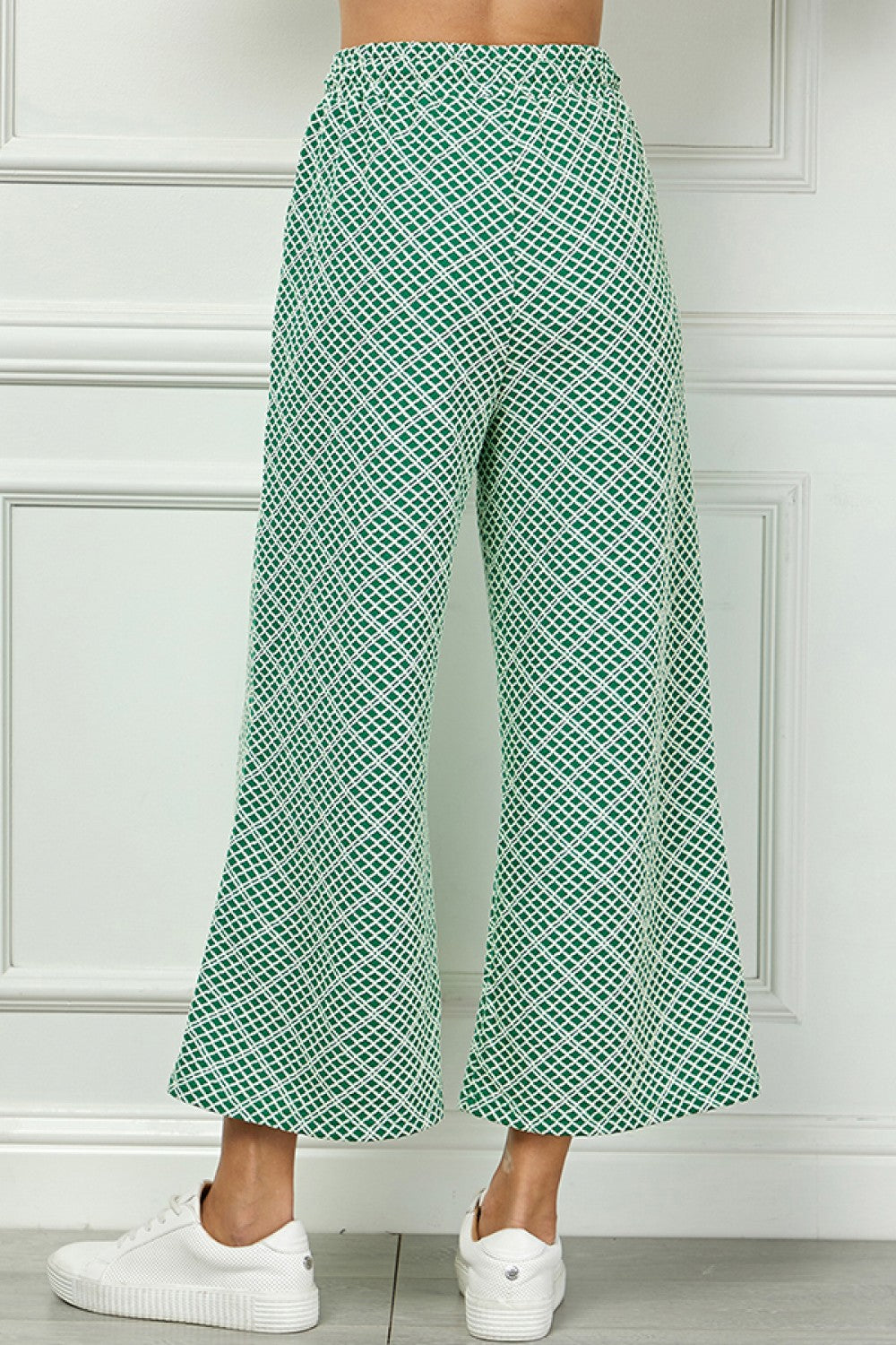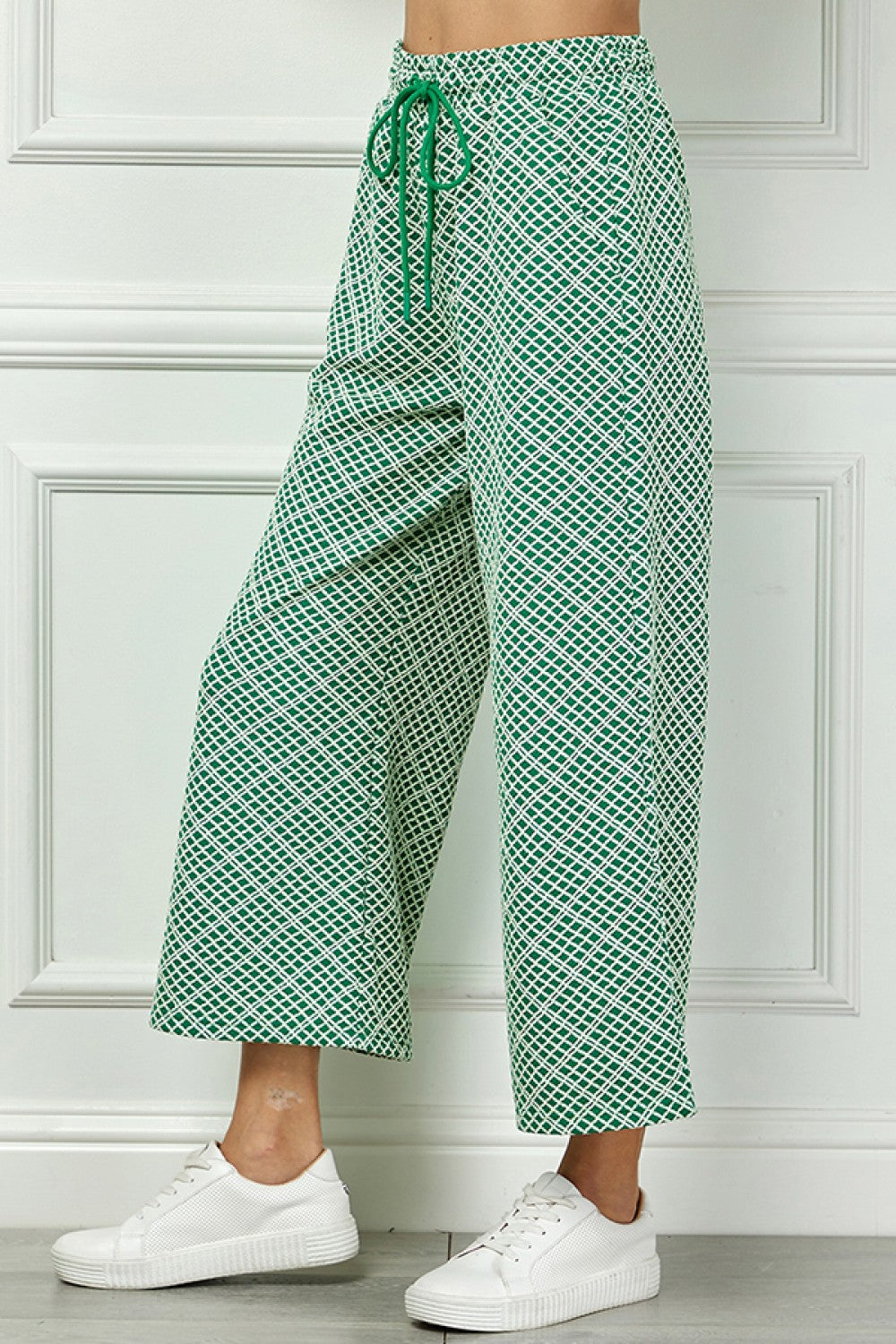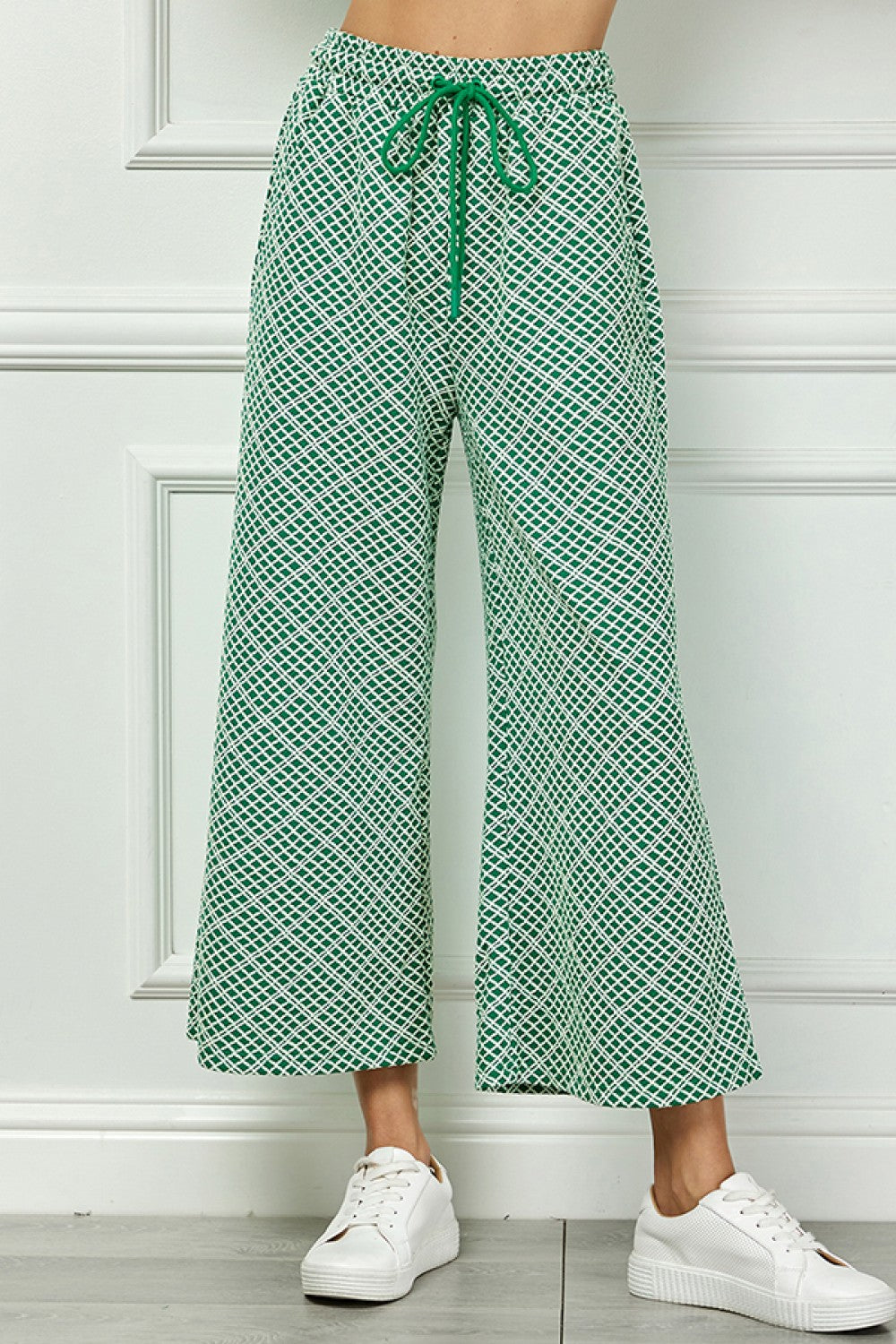 Expertly crafted with a textured design, these green and white cropped pants are sure to elevate any outfit. The added convenience of pockets makes them perfect for a busy day out. Stay stylish and functional with these must-have pants.