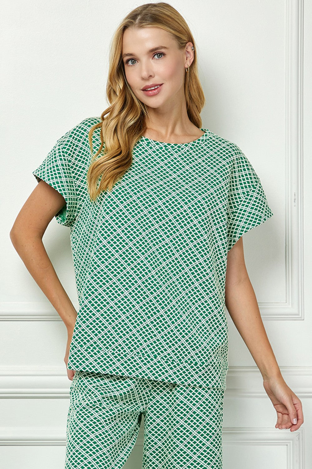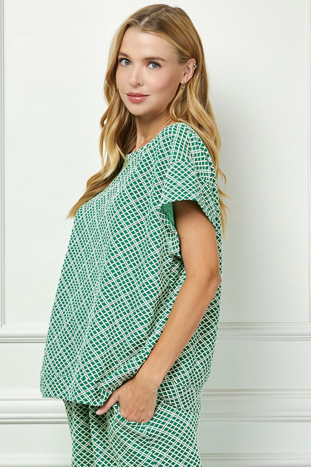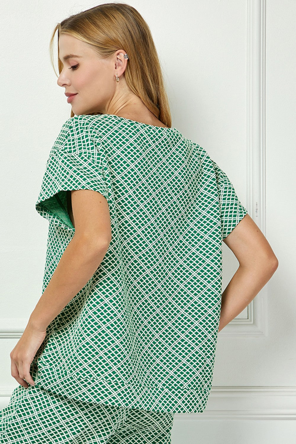 Upgrade your wardrobe with our stylish Textured Top in Green & White. The textured fabric adds a touch of elegance to this short sleeve top, perfect for any occasion. Made with high-quality materials for a comfortable fit. Upgrade your style game now!