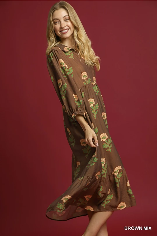 The Tiffany Dress in brown features a beautiful floral print on a rich brown background. With long bubble sleeves and a split v-neck with collar, this dress exudes elegance. The 3/4 length sleeves add a touch of sophistication, making it a must-have for any occasion.