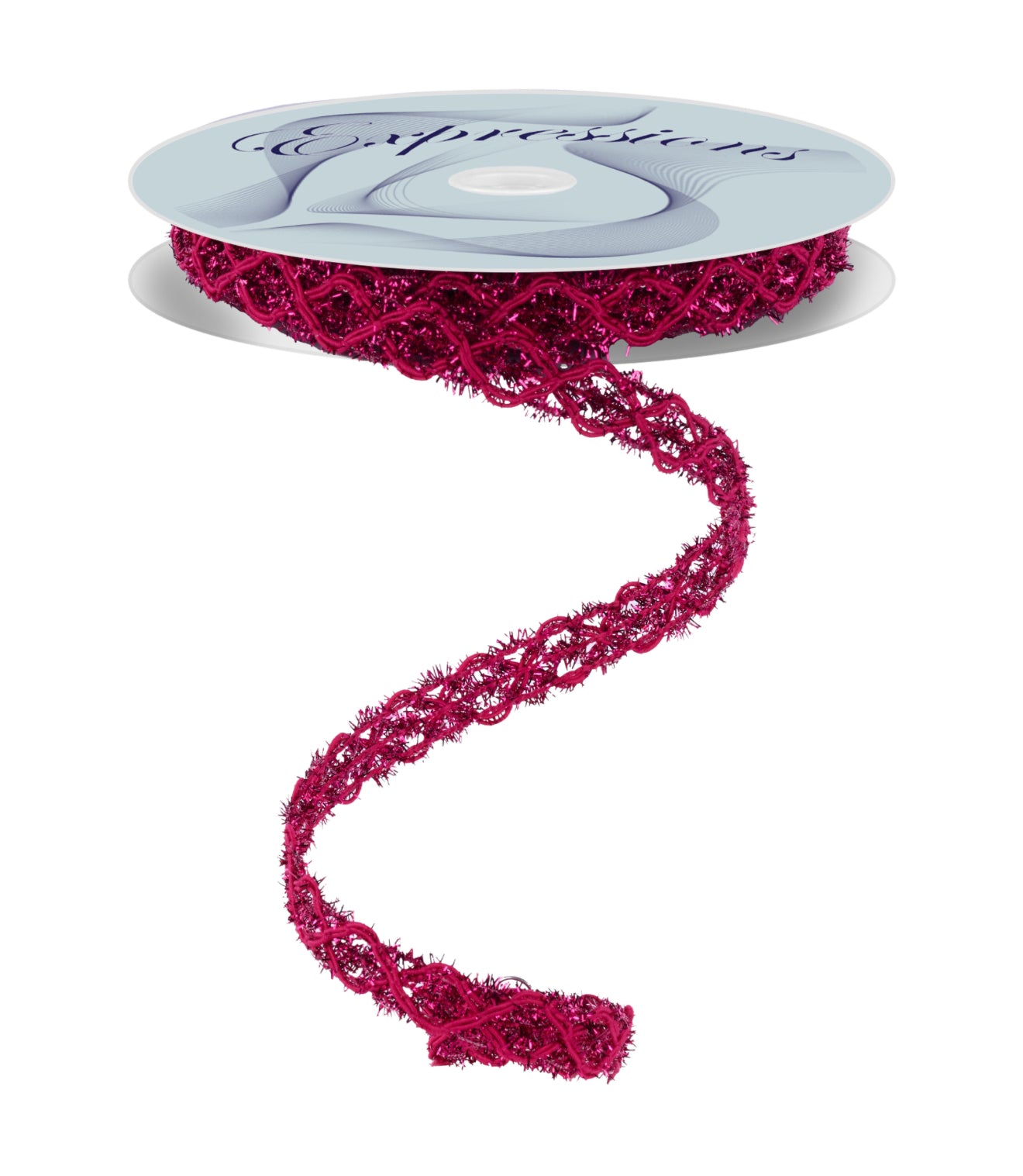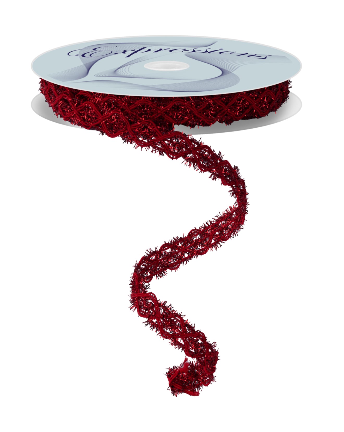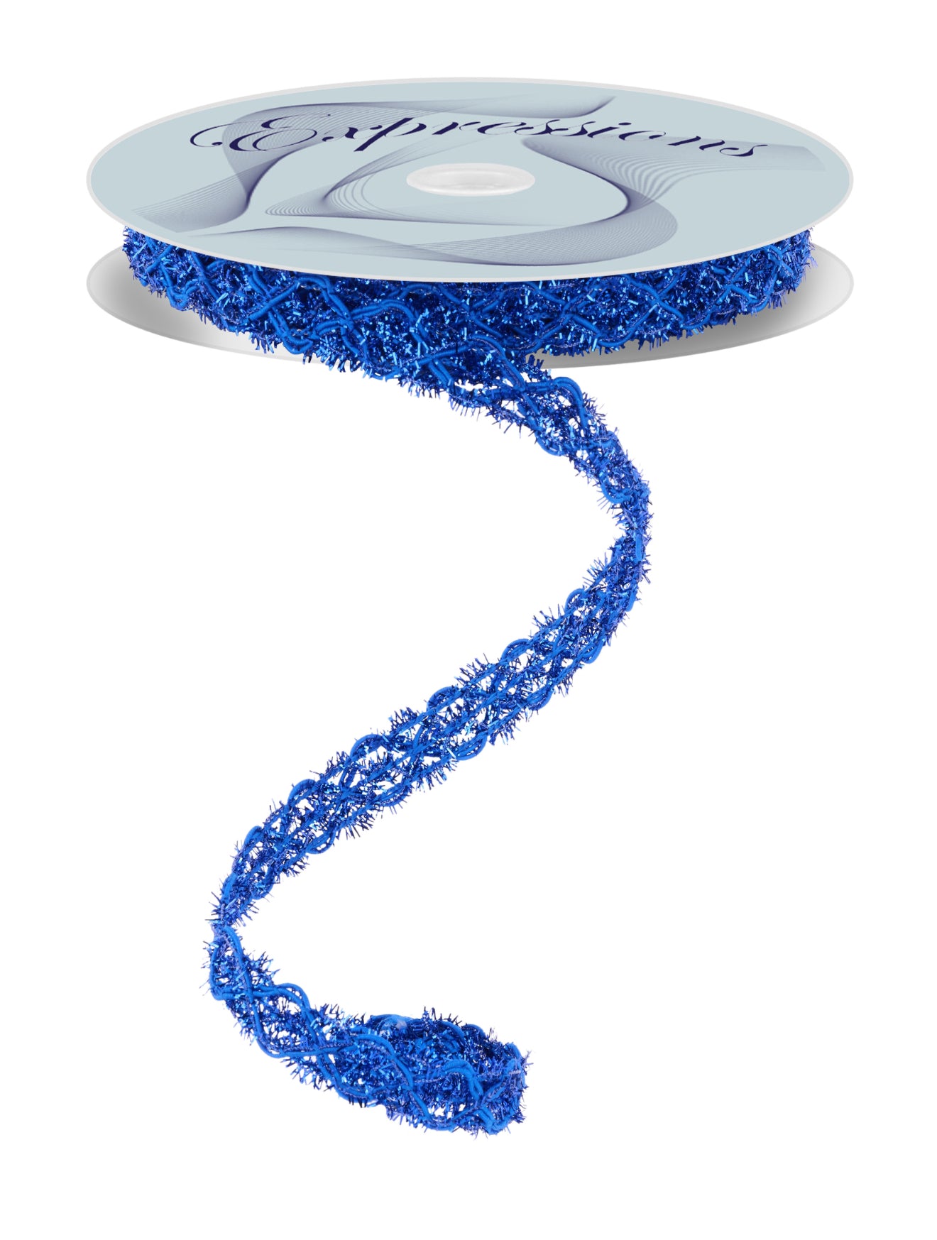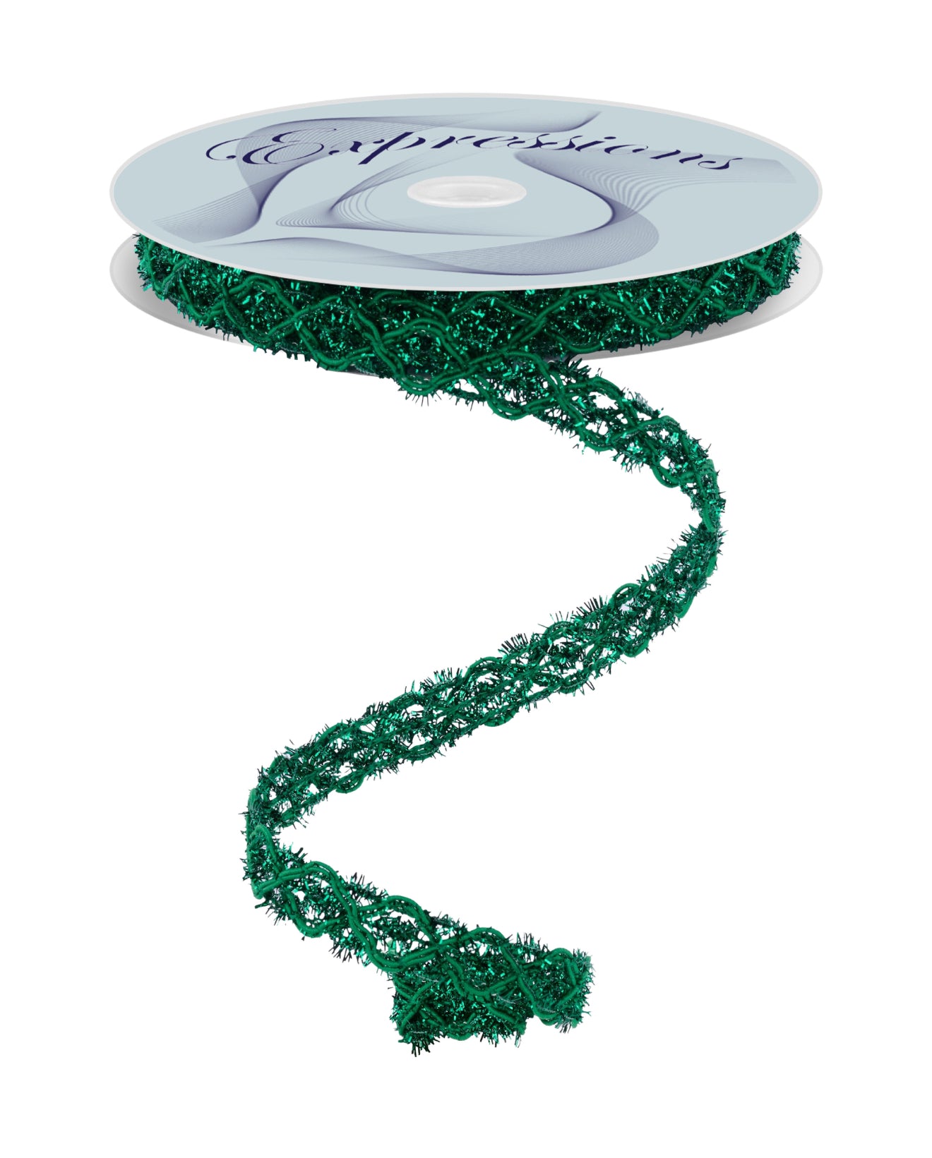 This Tinsel Lace Ribbon, measuring 5/8 inches wide and available in 10 yard rolls and multiple colors, adds a touch of glamour to any project. The delicate tinsel lace detail adds a unique and eye-catching element to your designs. Perfect for crafts, decorations, and more.