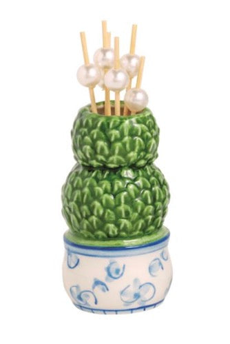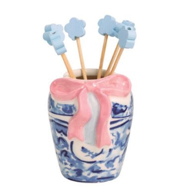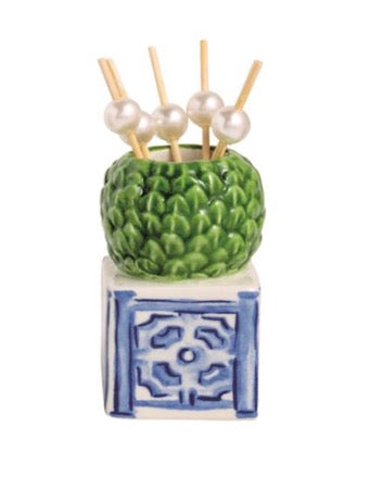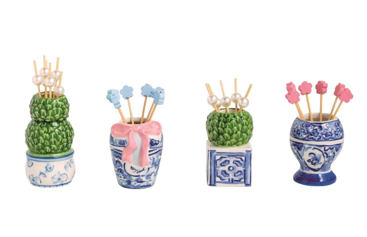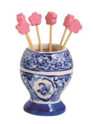 2-piece set. Hand-painted ceramic caddy holds pack of icon topped wooden toothpicks. Comes in kraft displayer.